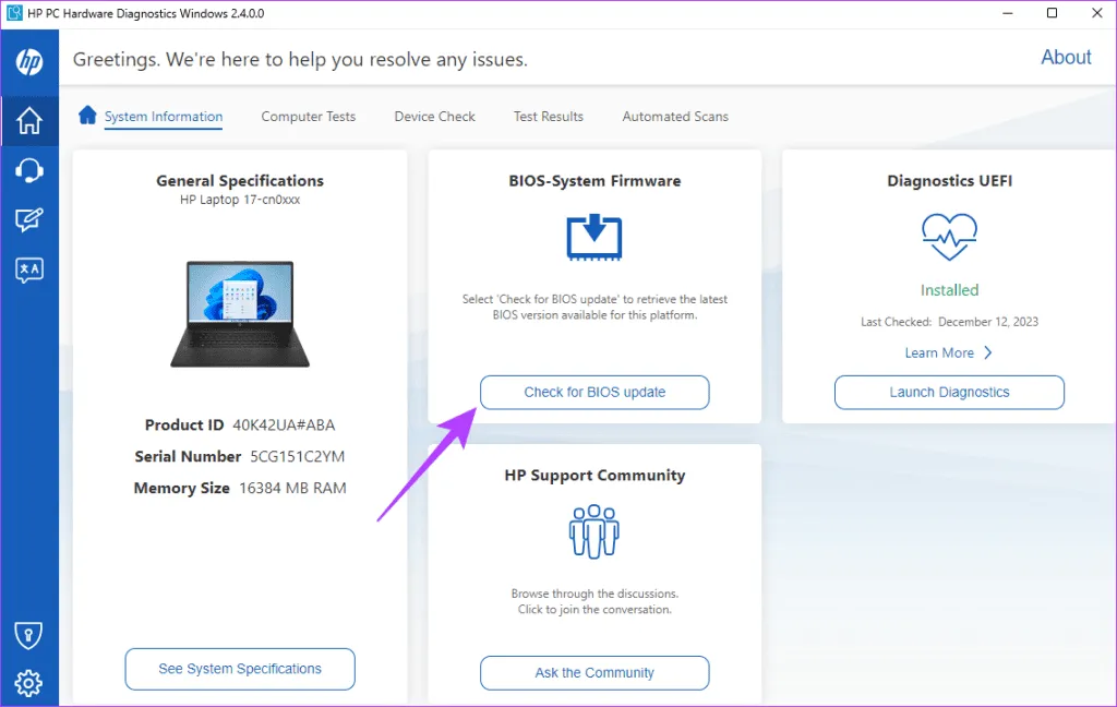 هنگامی که ویندوز 11 پردازنده گرافیکی را شناسایی نمی کند، بروز رسانی بایوس بسیار مهم است زیرا ممکن است یک GPU جدیدتر برای سازگاری و ارتباط مناسب مادربرد ببروز رسانی نیاز داشته باشد.همچنین از آنجایی که BIOS جزء سخت افزاری را کنترل می کند.اگر تغییراتی در تنظیمات BISO ایجاد کرده اید، می توانید آن را به حالت پیش فرض خود بازگردانید.توجه داشته باشید که فرآیند بهروزرسانی بایوس بسته به سازنده متفاوت است، بنابراین ممکن است مجبور شوید با سازنده مشورت کنید.با این حال، نحوه به روز رسانی HP BIOS را در زیر با استفاده از HP PC Hardware Diagnostics به شما نشان می دهیم. ویندوز11 مرحله 1: نرم افزار HP PC Hardware Diagnostics را دانلود و بر روی رایانه خود نصب کنید.دانلود HP PC Hardware Diagnostics مرحله 2: ابزار تازه نصب شده را راه اندازی کنید