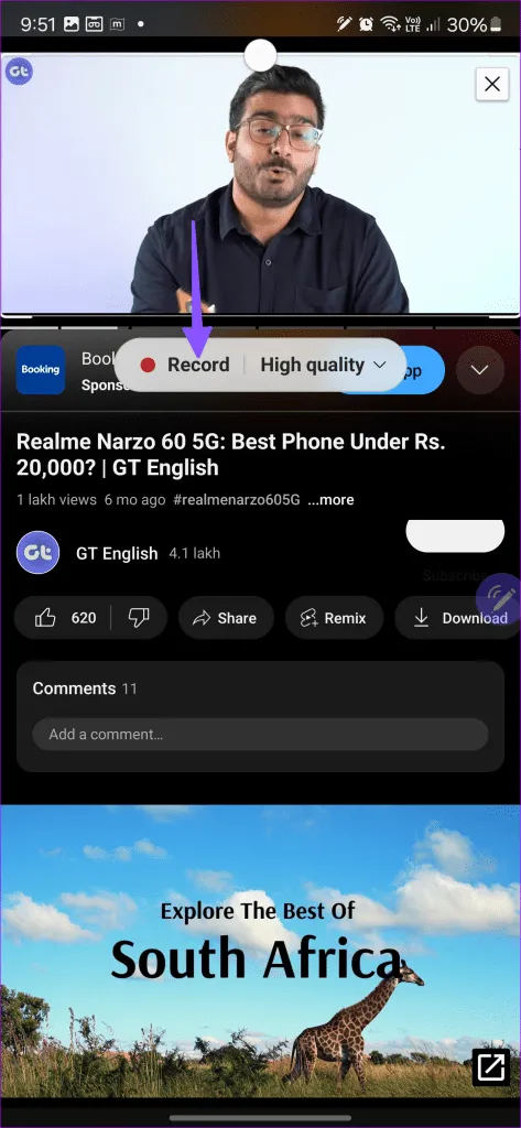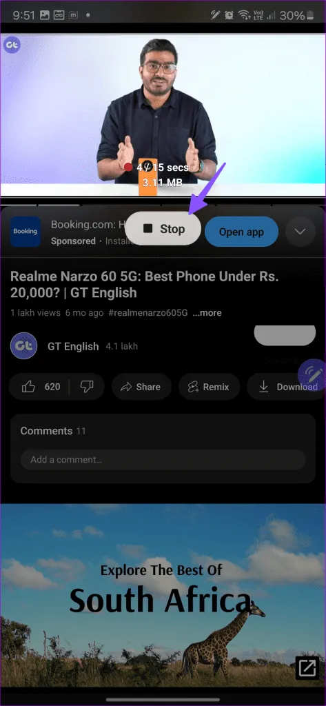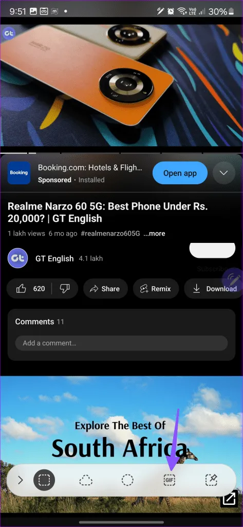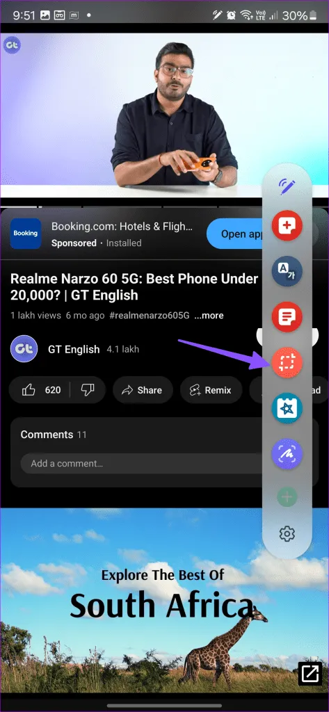 S Pen با انتخاب هوشمند ارائه می شود که به شما امکان می دهد از صفحات وب خود اسکرین شات های دقیق بگیرید.یکی دیگر از افزونه های مفید، امکان ایجاد GIF از هر ویدیویی است. مرحله 1: هر ویدیویی را در تلفن خود باز کنید.بیایید یوتیوب را به عنوان مثال در نظر بگیریم. مرحله 2: قلم S را بیرون بکشید و از منوی Command روی Smart Select ضربه بزنید. مرحله 3: GIF را در پایین انتخاب کنید و فریم اطراف ویدیو را تنظیم کنید.