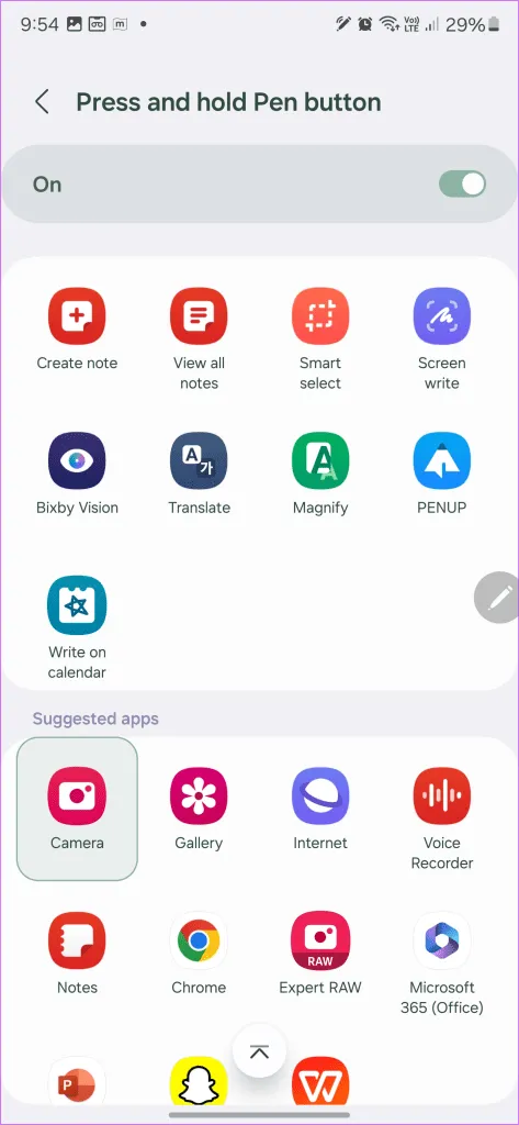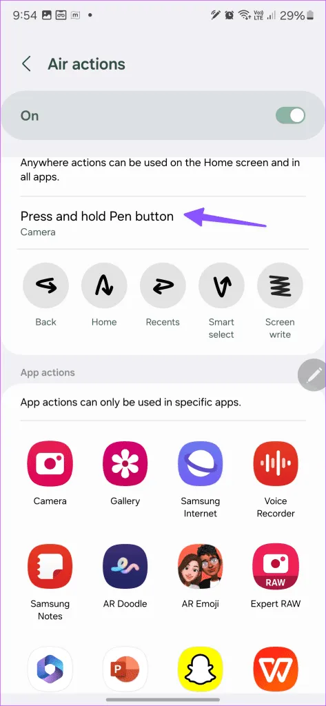 مرحله 3: روی «دکمه Pen را فشار دهید و نگه دارید» ضربه بزنید و برنامه مورد نظر خود را از منوی زیر انتخاب کنید.
