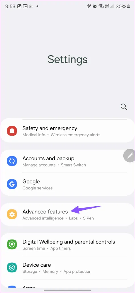 در حالی که قرار است برنامه دوربین را راه اندازی کند، می توانید هر برنامه ای را به دکمه S Pen اختصاص دهید. مرحله 1: تنظیمات را باز کنید و به ویژگی های پیشرفته بروید.