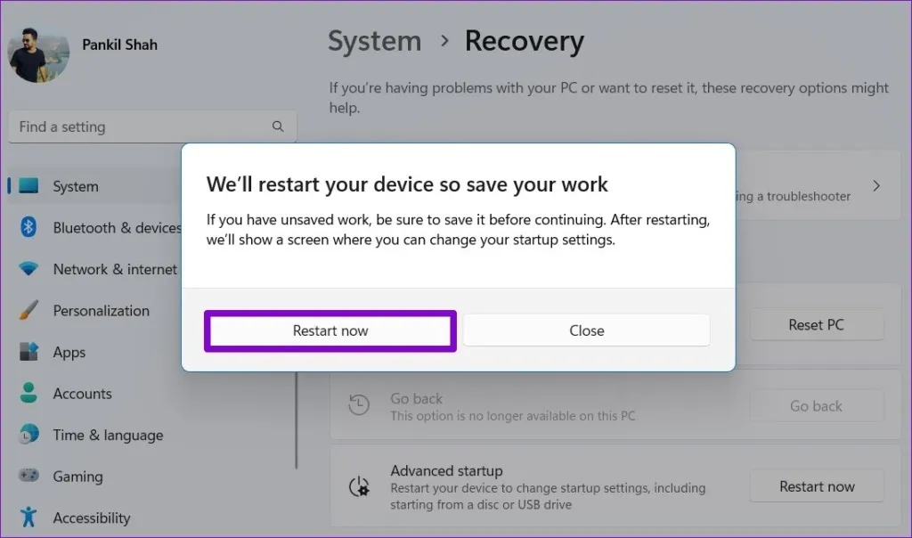مرحله 3: برای تایید گزینه Restart now را انتخاب کنید.