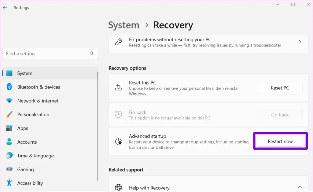 مرحله 2: روی دکمه Restart now در کنار Advanced startup کلیک کنید.