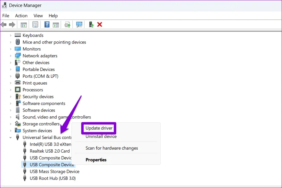 درایورهای USB قدیمی یا ناسازگار در رایانه شخصی شما ممکن است دلیل مشکلات پورت USB-C شما باشد.در این صورت، بروز رسانی درایورهای کامپیوتر شما باید مشکل را حل کند. مرحله 1: روی نماد Start کلیک راست کرده و Device Manager را از لیست انتخاب کنید..