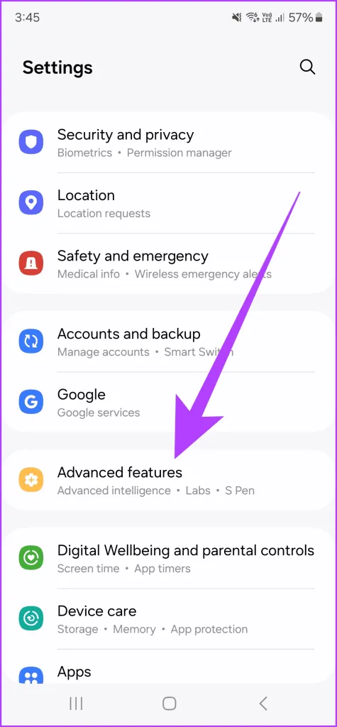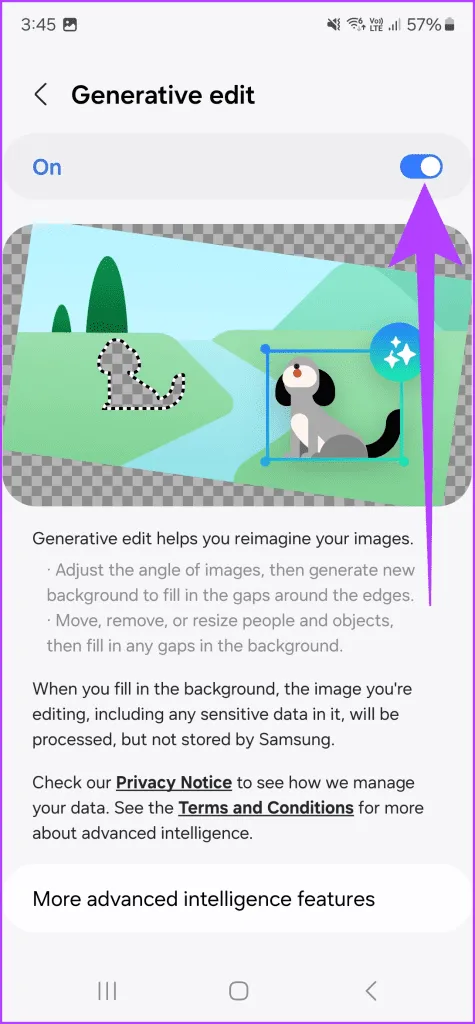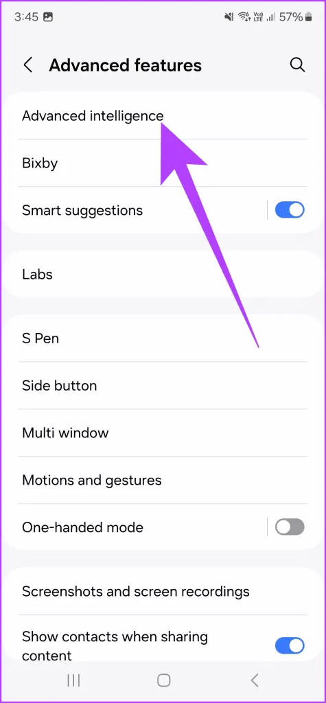قبل از اینکه بتوانید از قابلیتهای هوش مصنوعی برای استفاده از ویرایش تولیدی روی عکس های خود استفاده کنید، باید این ویژگی را فعال کنید..برای اینکار به تنظیمات ویژگی های پیشرفته بروید و روی هوش پیشرفته ضربه بزنید.