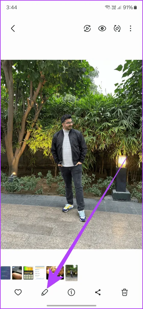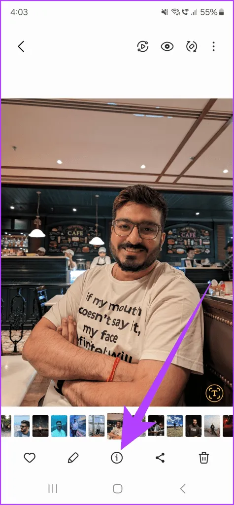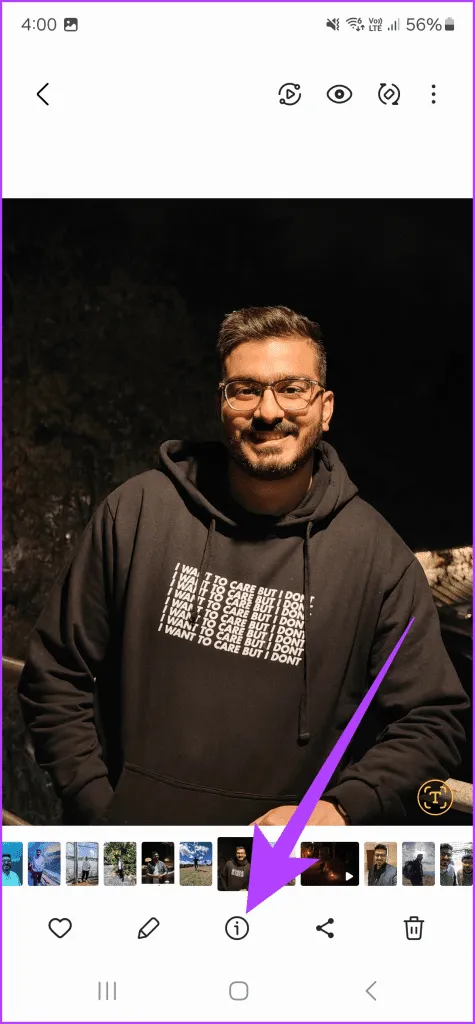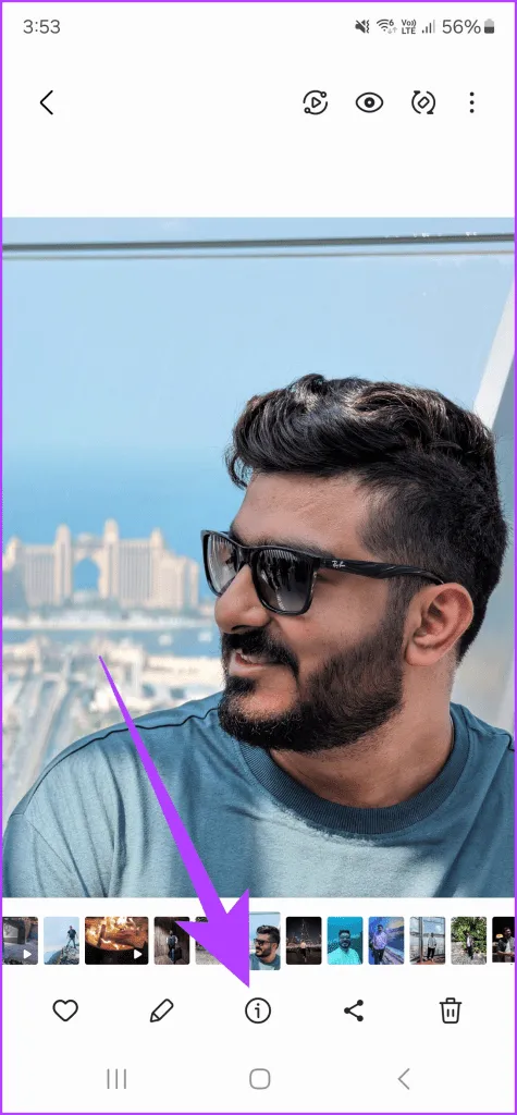 اجازه دهید.آی تی.از سوی دیگر، مواقعی وجود دارد که بازتاب های ناخواسته ای نیز به عنوان بخشی از تصویر دارید.خوشبختانه، سری گلکسی S24 دارای ویرایش عکس با هوش مصنوعی در داخل گالری است یک بار دیگر، با باز کردن تصویری که میخواهید در برنامه گالری ویرایش کنید، شروع کنید.سپس، روی نماد اطلاعات در نوار پایین ضربه بزنید.S24.