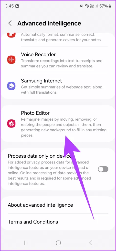 در اینجا اسکرول کنید و روی Photo Editor ضربه بزنید.در نهایت، ضامن برای ویرایش Generative را فعال کنید.