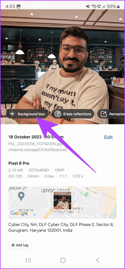 یکی از بزرگترین پیشرفت ها در عکاسی با گوشی های هوشمند، حالت پرتره بوده است.با این حال، گاهی اوقات فراموش می کنید که دوربین را به حالت پرتره تغییر دهید.اگر میخواهید بوکه را به تصویری که قبلاً کلیک کردهاید اضافه کنید، Galaxy S24 گزینهای برای این کار دارد.تصویر مورد نظر برای ویرایش را در برنامه گالری باز کنید.سپس، روی نماد اطلاعات در نوار پایین ضربه بزنید.در روش دیگر، انگشت خود را روی صفحه به سمت بالا بکشید تا اطلاعات مربوط به عکس نشان داده شود.سپس، روی ضربه بزنید.