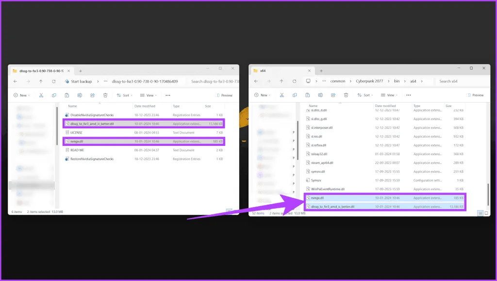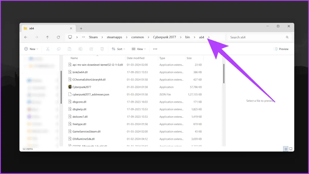 مرحله 4: اکنون، در یکی دیگر از پنجره های Windows Explorer، به محل نصب بازی که می خواهید مود را در آن نصب کنید بروید..به عنوان مثال، برای Cyberpunk 2077، این دایرکتوری حاوی Cyberpunk2077 است..exe.