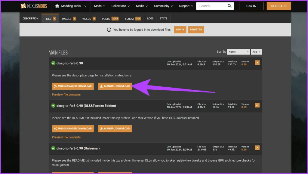 مرحله 2: در مرحله بعد، آخرین بیلد dlssg-to-fsr3 mod را از لینک زیر دانلود کنید..در حالی که نسخه های مختلف موجود است، نسخه استاندارد باید کار کند.دانلود dlssg-to-fsr3 مودروی.توجه داشته باشید که برای دانلود فایل باید در NexusMods ثبت نام کنید.