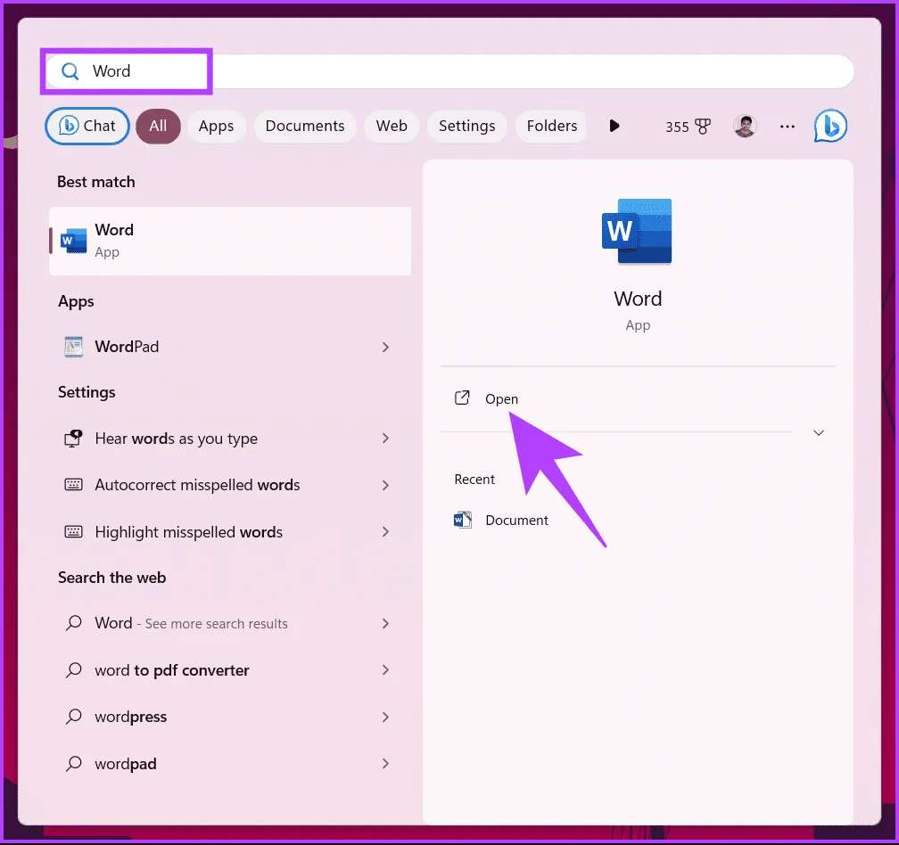مرحله 1: کلید Windows را روی صفحه کلید خود فشار دهید، Microsoft Word را تایپ کنید و روی Open کلیک کنید.