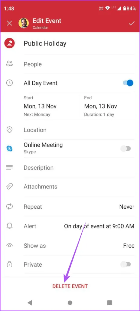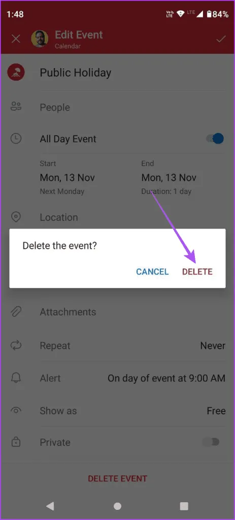 مرحله 3: روی Delete Event در پایین ضربه بزنید و برای تایید دوباره Delete را انتخاب کنید.