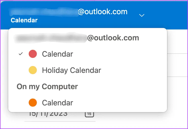 اگر چندین تقویم از حساب های ایمیل مختلف دارید، روی نماد فلش رو به پایین در بالا ضربه بزنید و تقویمی را که میخواهید این تعطیلات را در آن اضافه کنید انتخاب کنید..