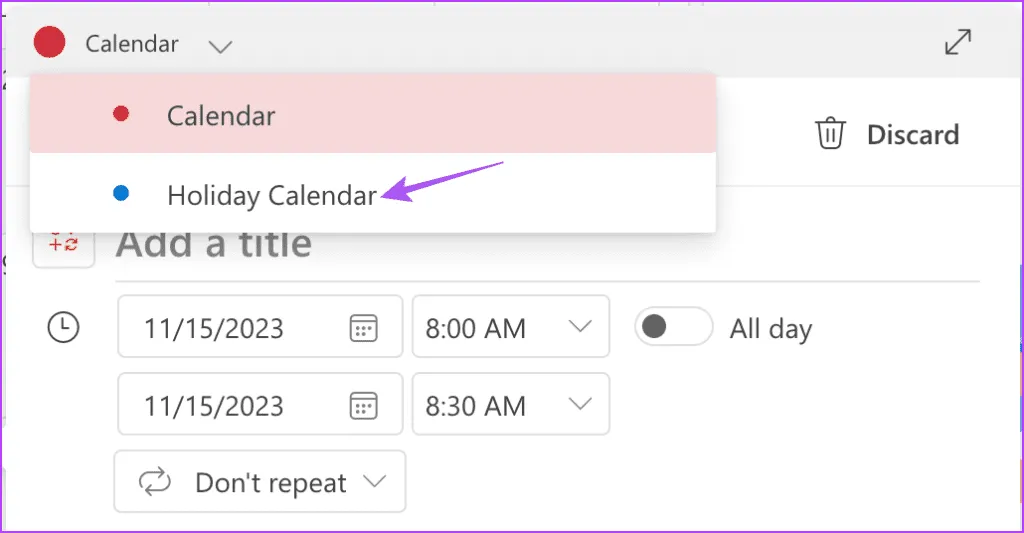 مرحله 6: روی تاریخ در تقویم خود دوبار کلیک کنید تا تعطیلات اضافه شود. مرحله 7:روی نماد فلش رو به پایین کلیک کنید و تقویم تعطیلاتی را که ایجاد کردید انتخاب کنید.