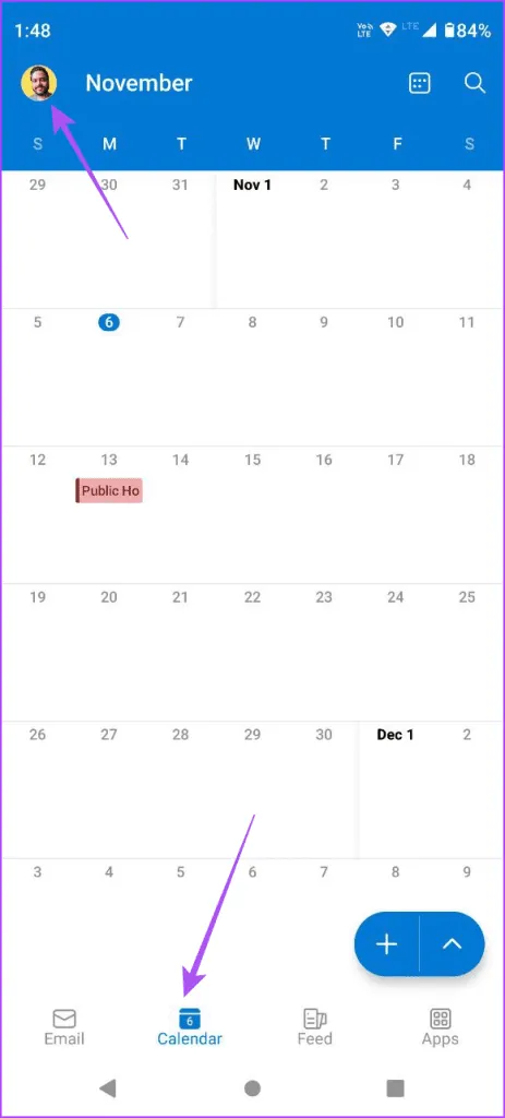 مرحله 2: روی Calendar در پایین ضربه بزنید و روی نماد حساب خود در گوشه بالا سمت چپ ضربه بزنید.