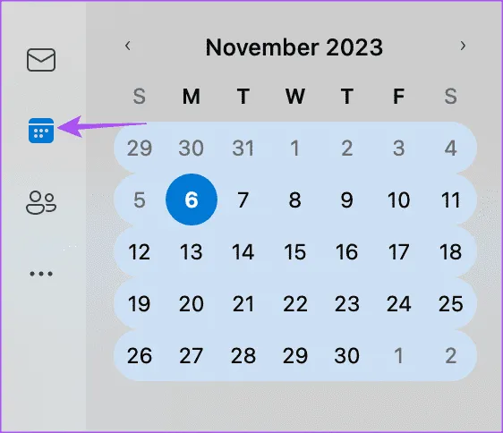 مرحله 1: برنامه Outlook را در رایانه شخصی ویندوز 11 خود باز کنید و روی نماد تقویم در نوار کناری سمت چپ کلیک کنید..