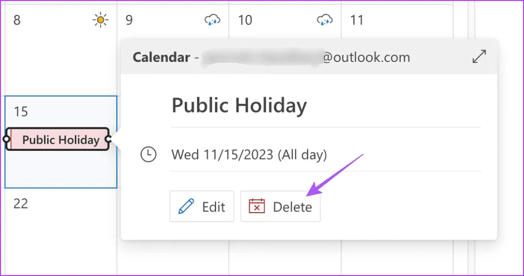 برای حذف تعطیلات از نسخه وب تقویم Outlook، روی نام تعطیلات دوبار کلیک کرده و روی Delete کلیک کنید..
