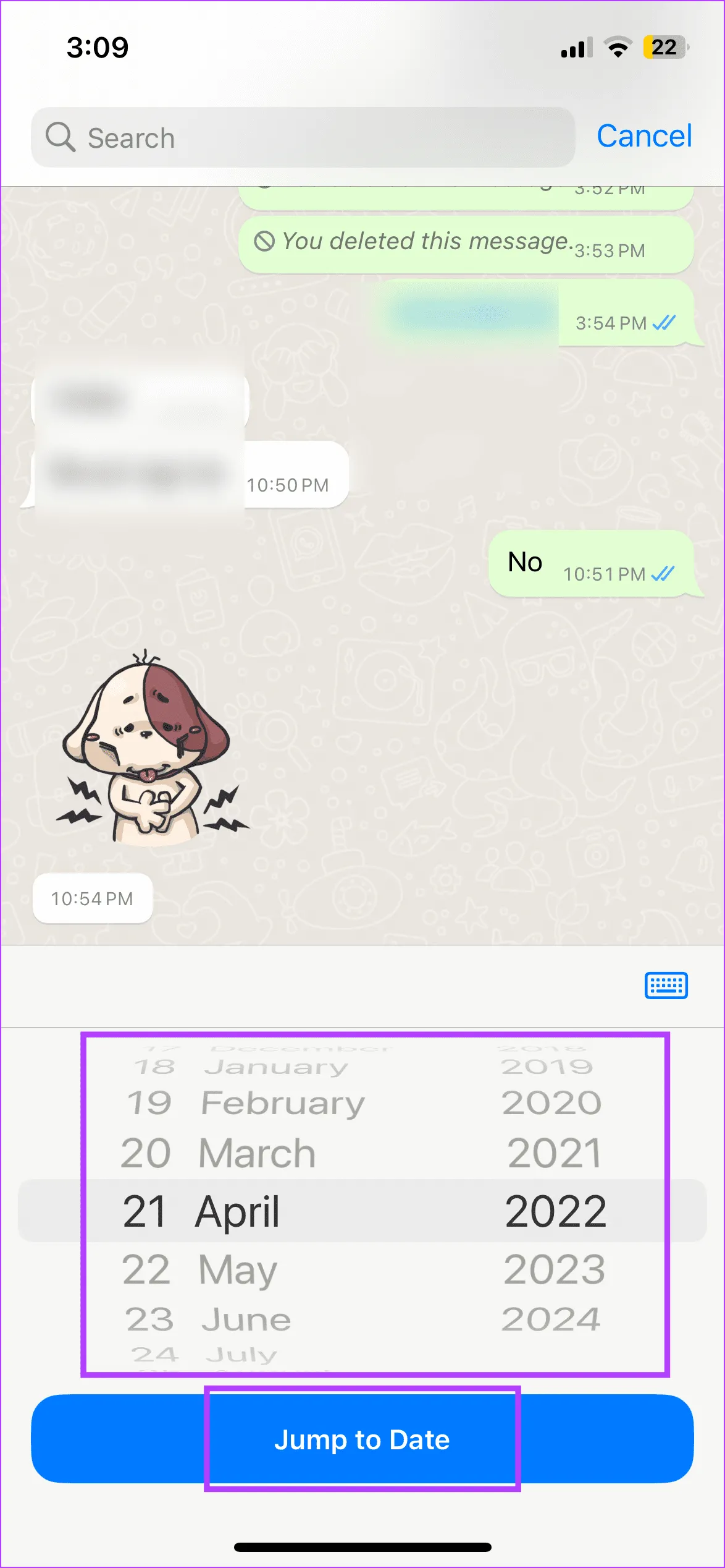 چت واتس اپ شما مستقیماً به تاریخ انتخاب شده خواهد رفت.اکنون می توانید با پیمایش در پنجره چت پیام مربوطه را جستجو کنید.