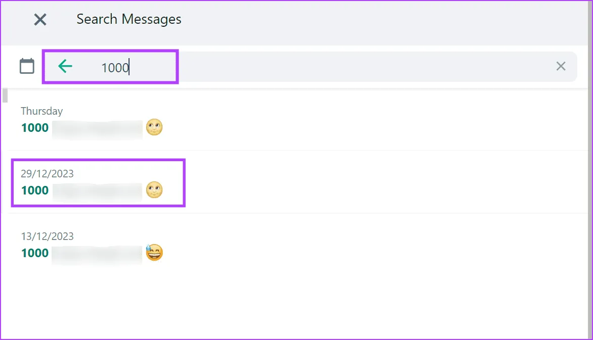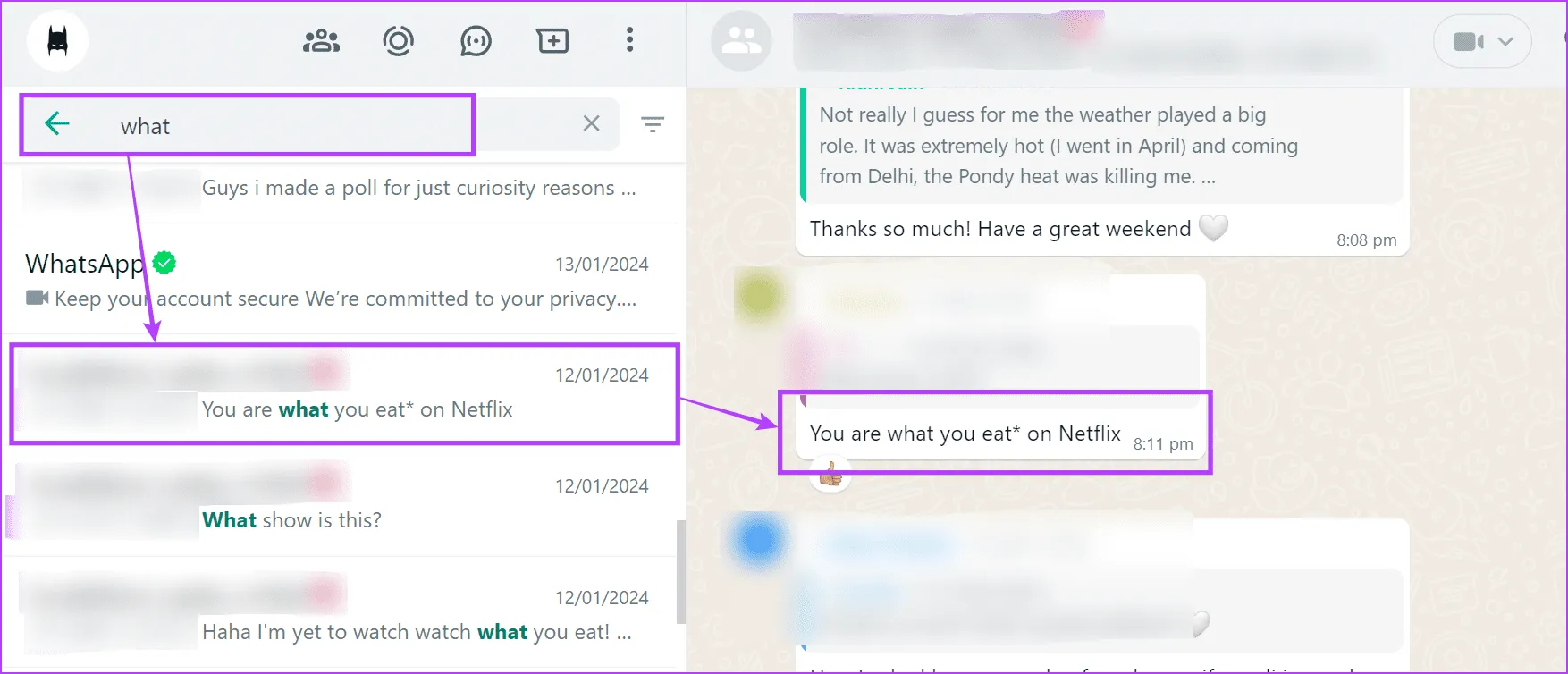 نتیجه جستجو در پنجره چت در واتس اپ وب برجسته می شود.همچنین میتوانید این مراحل را برای جستجوی سؤالات دیگر در پنجره چت در واتساپ وب تکرار کنید.همچنین بخوانید: نحوه رفع مشکل عدم همگام سازی وب واتساپ.
