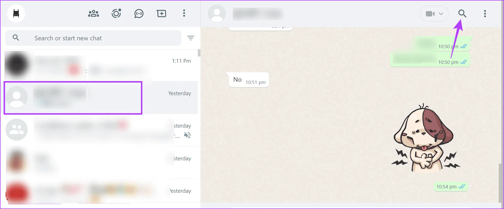 مرحله 1: واتس اپ وب را در هر مرورگری باز کنید.سپس روی چت مربوطه کلیک کنید.واتس اپ را باز کنید مرحله 2: در اینجا، روی نماد ذره بین در گوشه سمت راست بالا کلیک کنید.