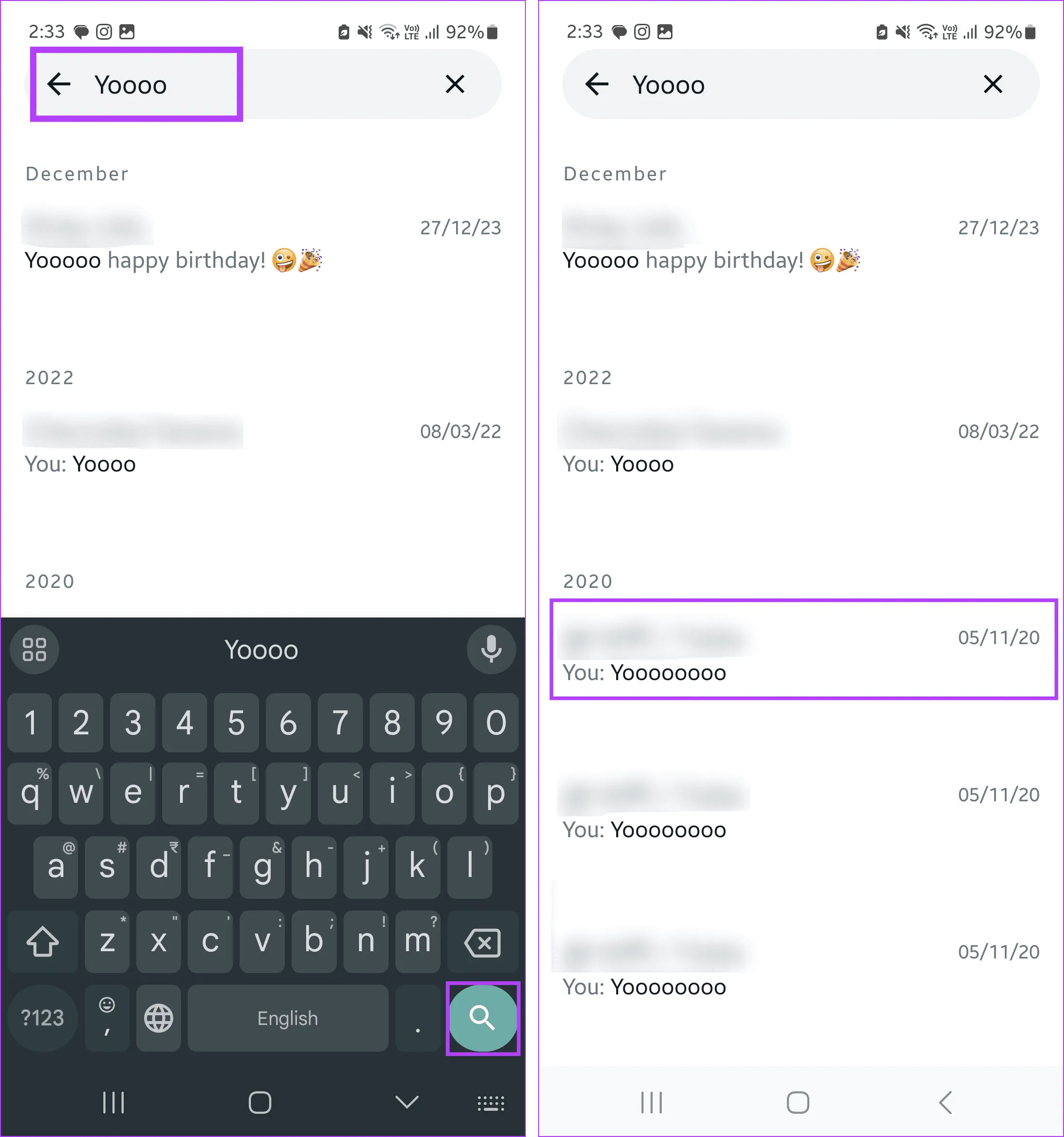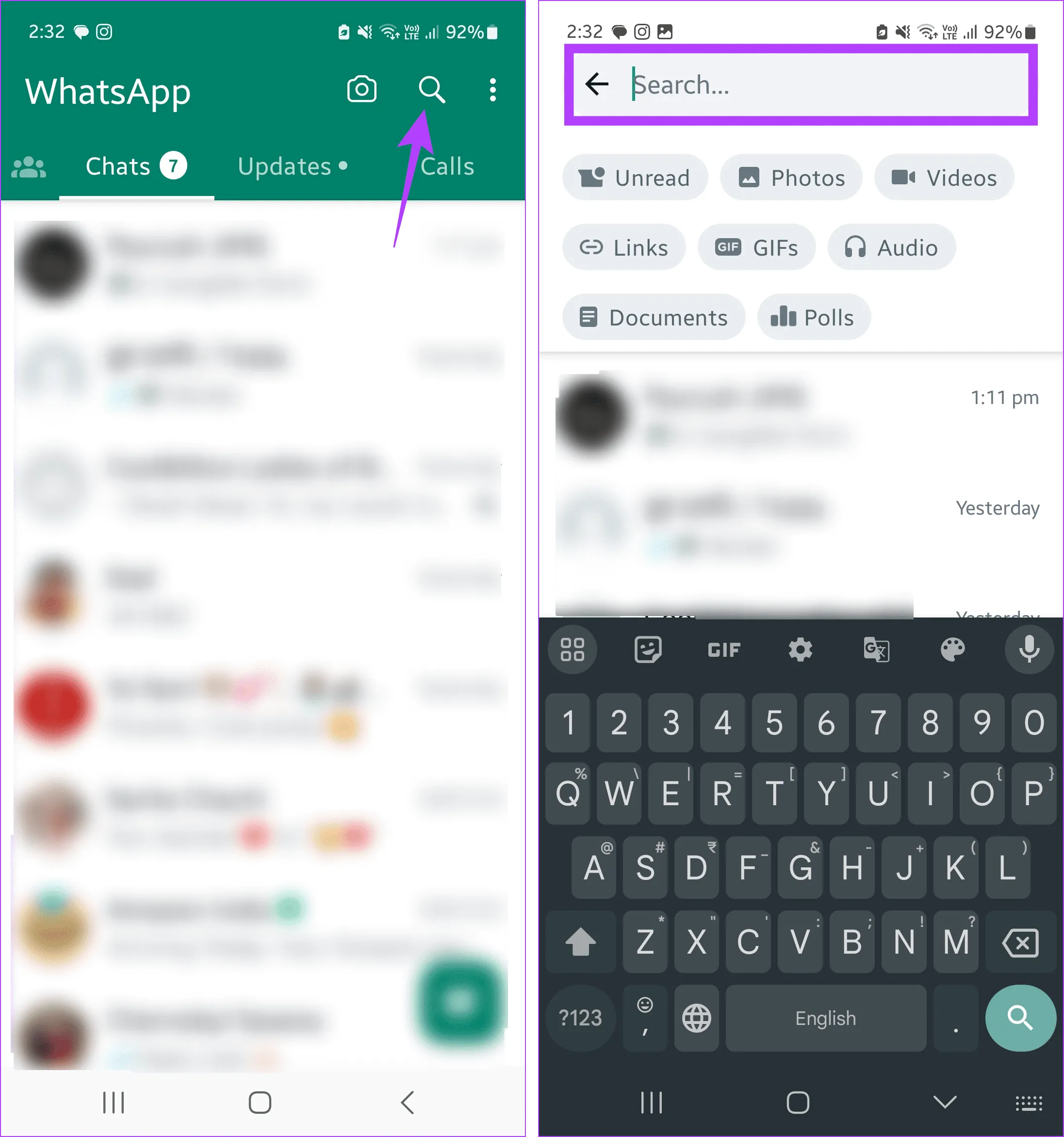 مرحله 1: در برنامه Android WhatsApp، روی نماد ذره بین در گوشه سمت راست بالا ضربه بزنید تا نوار جستجو باز شود..سپس روی نوار جستجو ضربه بزنید تا شروع به تایپ کنید.کاربران iOS برای شروع میتوانند روی نوار جستجو در بالا ضربه بزنند.نکته: می توانید نوع رسانه را انتخاب کنید.ه.، صدا، گیف، صدا و موارد دیگر، برای جستجوی سریع پیام مربوطه.