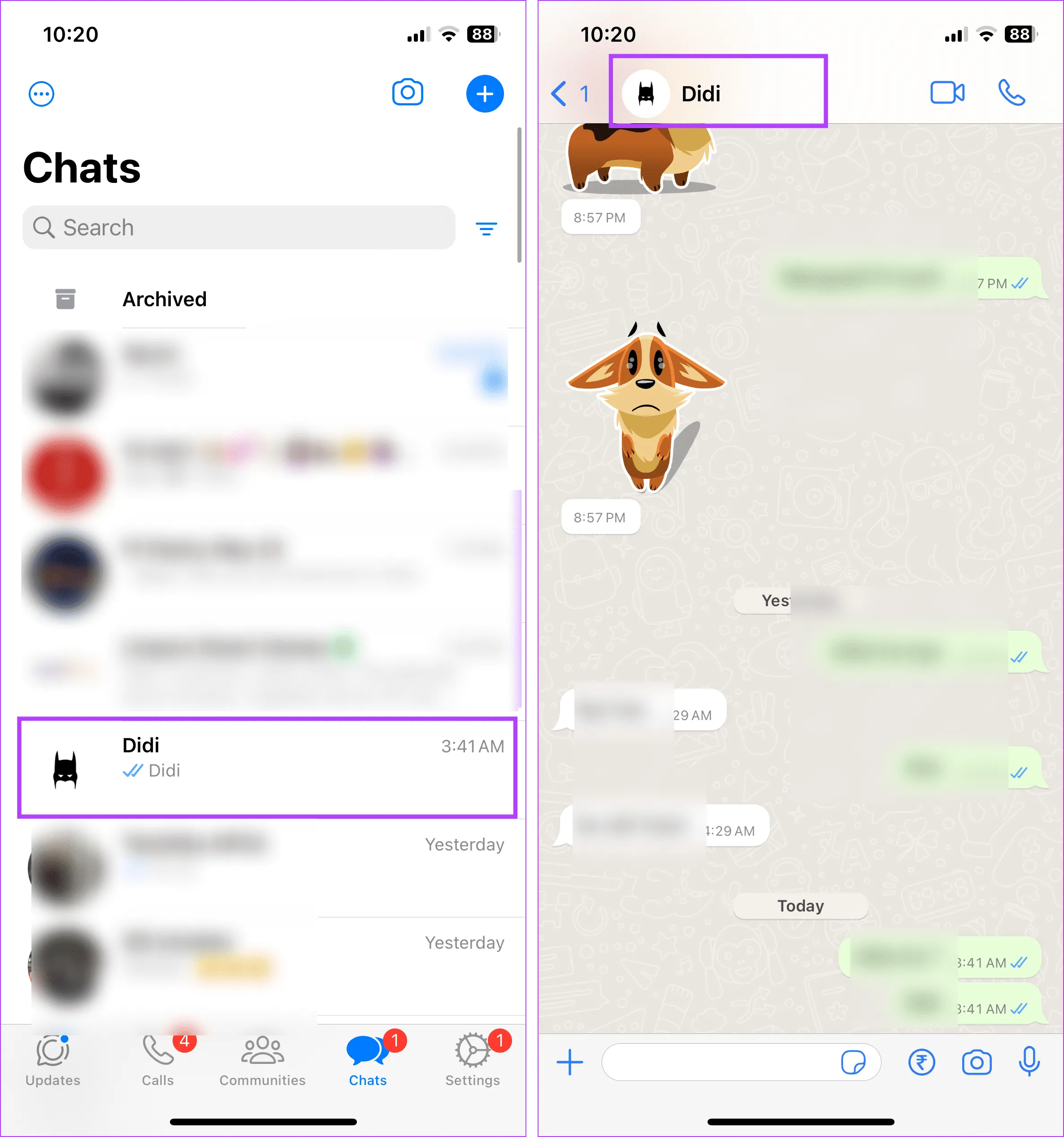 مرحله 1: برنامه WhatsApp iOS را باز کنید و روی مخاطب مربوطه ضربه بزنید. مرحله 2: در اینجا، روی نام مخاطب ضربه بزنید تا تنظیمات باز شود.