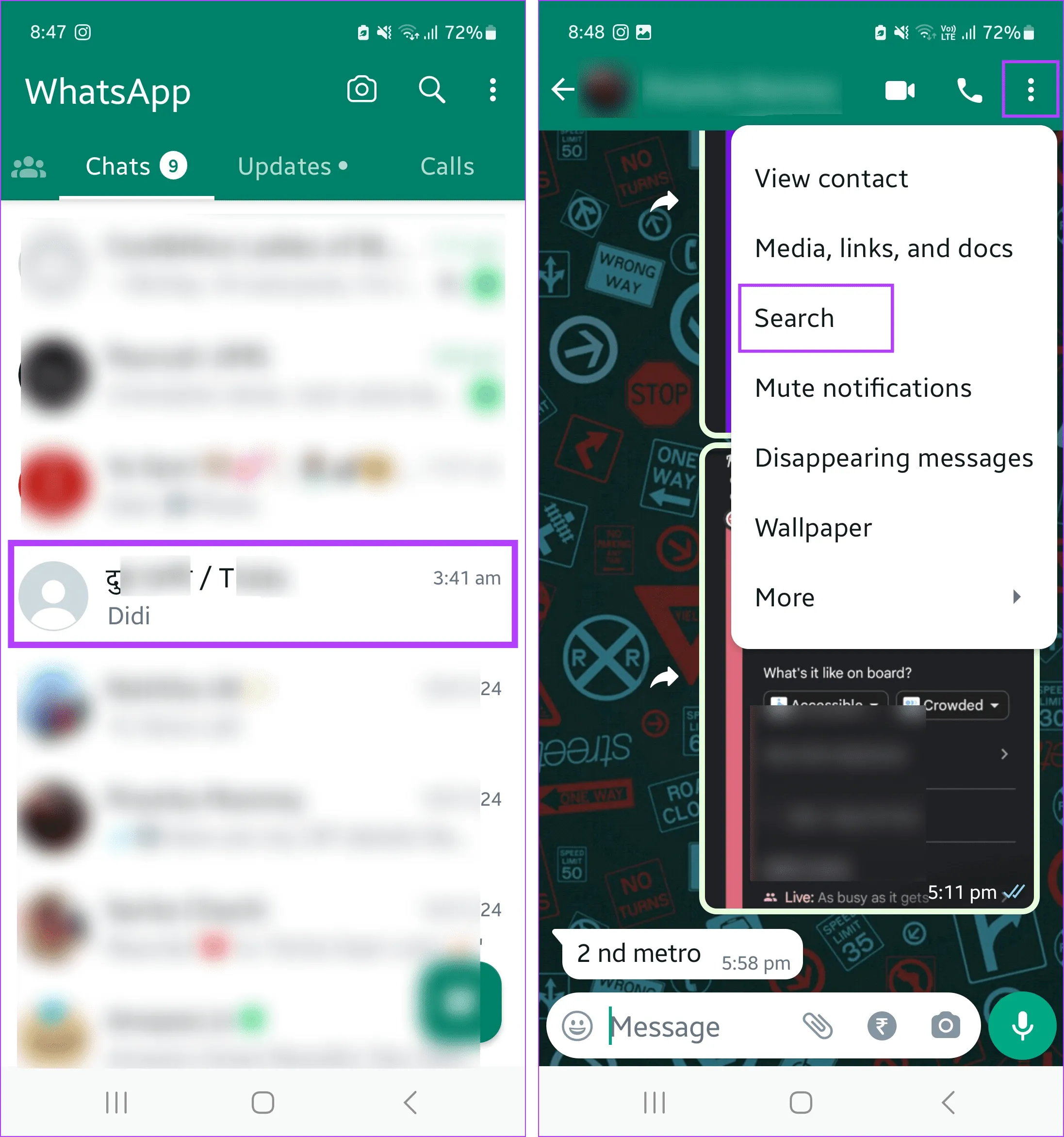 توجه: این گزینه فقط در اپلیکیشن واتس اپ اندروید موجود است. مرحله 1: برنامه WhatsApp Android را باز کنید و روی چت فردی یا گروهی مربوطه ضربه بزنید. مرحله 2: اکنون روی نماد سه نقطه در گوشه سمت راست بالا ضربه بزنید.در اینجا، روی Search ضربه بزنید.