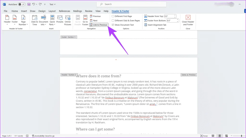 مرحله ۲: قسمت Navigation را پیدا کرده و روی دکمه Link to Previous کلیک کنید.توجه: مطمئن شوید که دکمه پیوند به قبلی خاکستری نباشد.