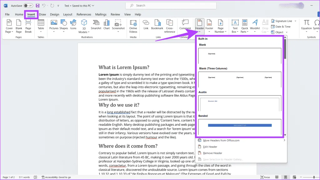 مرحله 3: به تب Insert بروید.سربرگ را پیدا کنید. مرحله 4 سربرگ ها و پاورقی های مختلف در صفحات مختلف در Word : یک الگوی سرصفحه یا پاورقی از پیش تعریف شده انتخاب کنید یا خالی را انتخاب کنید.