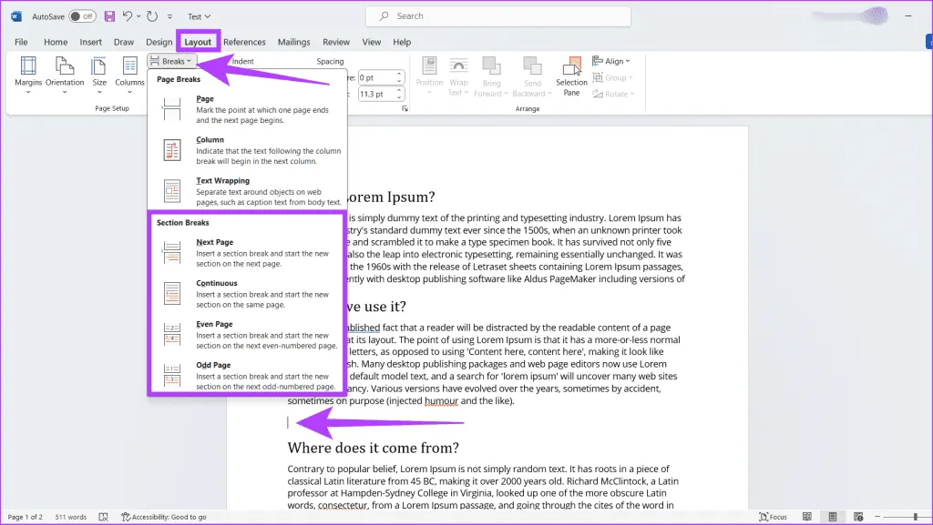 مرحله 2: مکان نما را در نقطه ای از سند خود قرار دهید. مرحله 3: به تب Layout در نوار بروید و روی فلش رو به پایین در کنار دکمه Breaks کلیک کنید. مرحله 4: یکی از وقفه های ذکر شده در زیر را انتخاب کنید:.