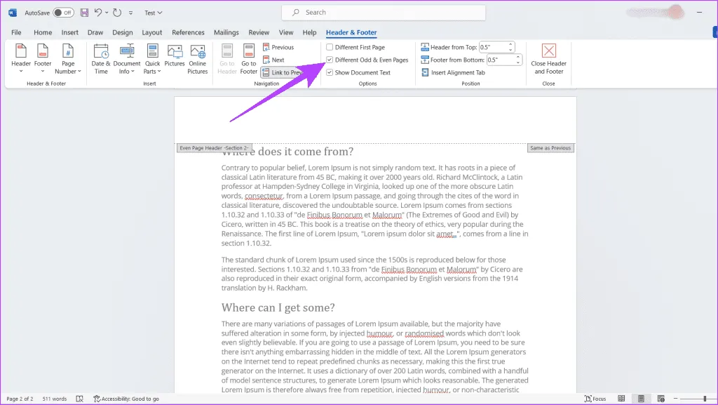 مرحله 5: هدر یا پاورقی را برای صفحات زوج و فرد ویرایش کنید. مرحله 6: پس از اتمام، Ctrl S را فشار دهید تا تغییرات خود را در سند ذخیره کنید.