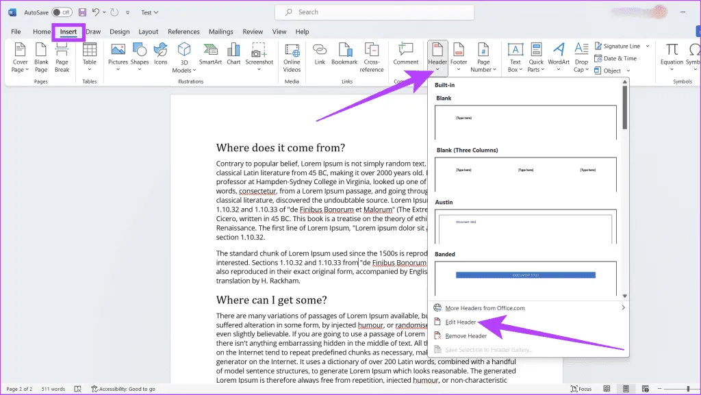 مرحله 2: روی Insert در منوی بالا کلیک کنید و دکمه کشویی زیر عنوان یا پاورقی را فشار دهید .مرحله 3: بسته به آنچه می خواهید تغییر دهید، Edit Header یا Edit Footer را انتخاب کنید.
