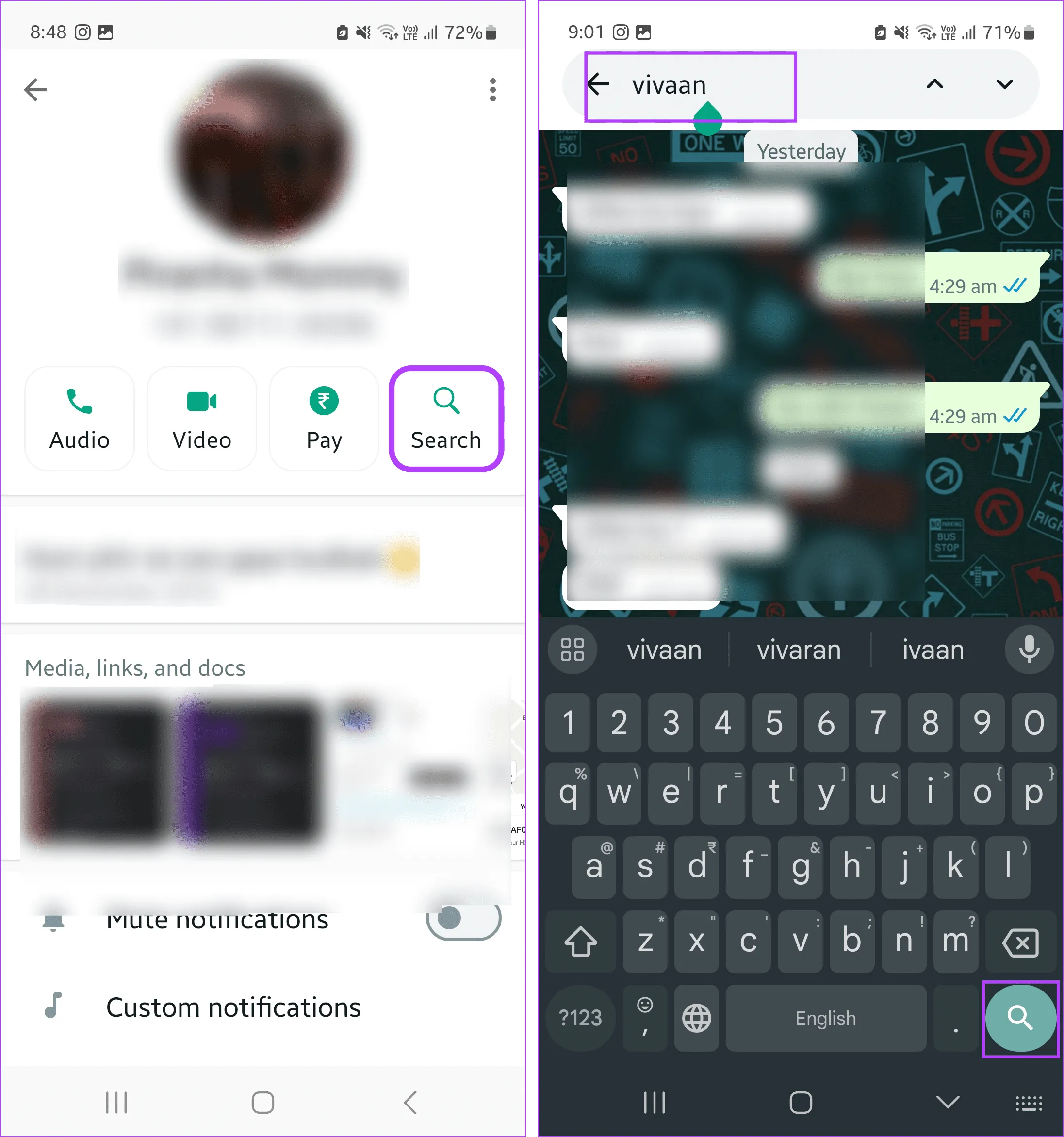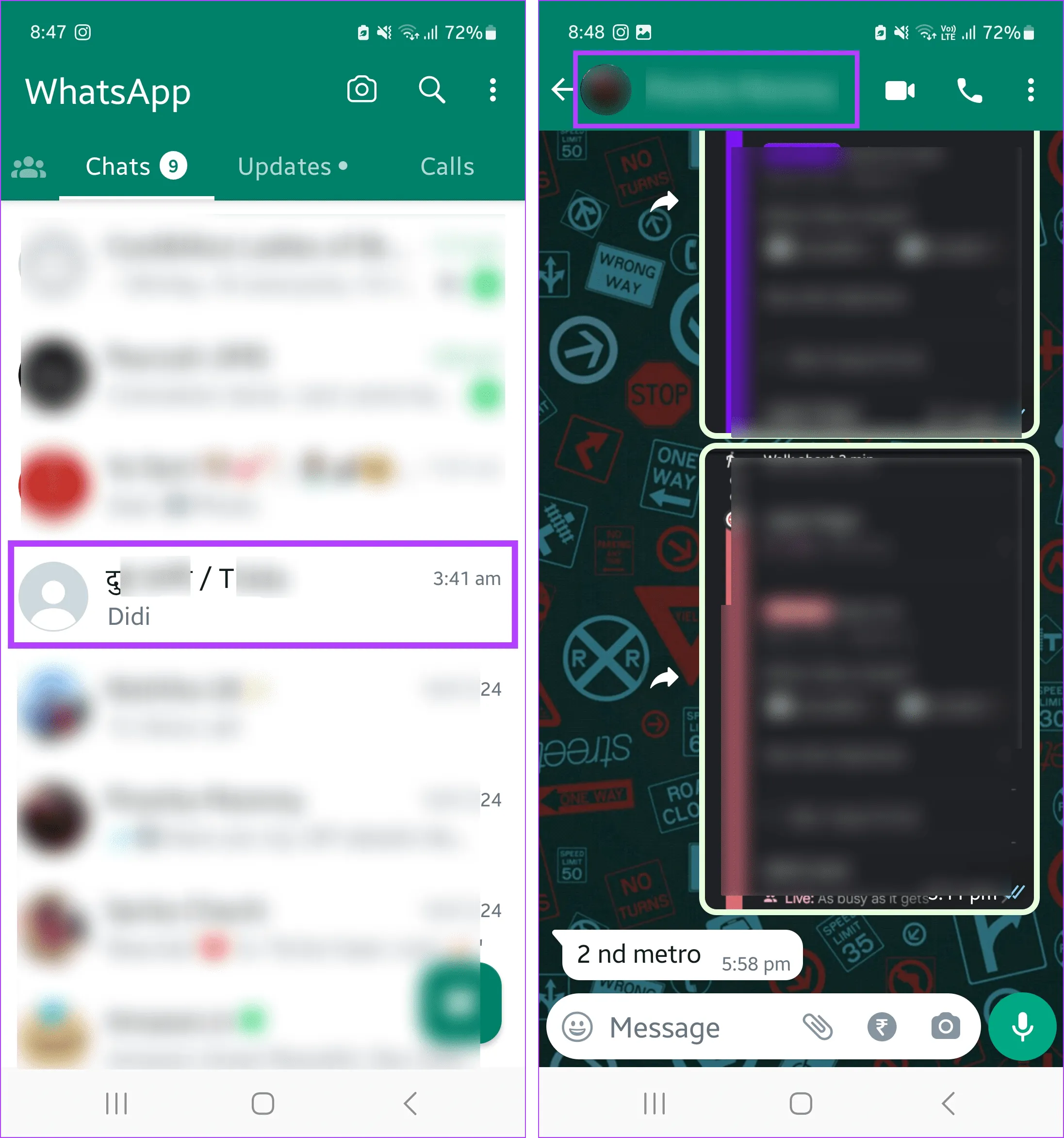 اگر اولین پیام یا یکی از اولین پیامهای ارسال شده به چت را به خاطر دارید، میتوانید از ویژگی جستجو برای رفتن به بالا بدون دردسر استفاده کنید..برای انجام آن مراحل زیر را دنبال کنید. مرحله 1: WhatsApp را در دستگاه تلفن همراه خود باز کنید و روی چت مربوطه ضربه بزنید. مرحله 2: سپس روی نام مخاطب ضربه بزنید.