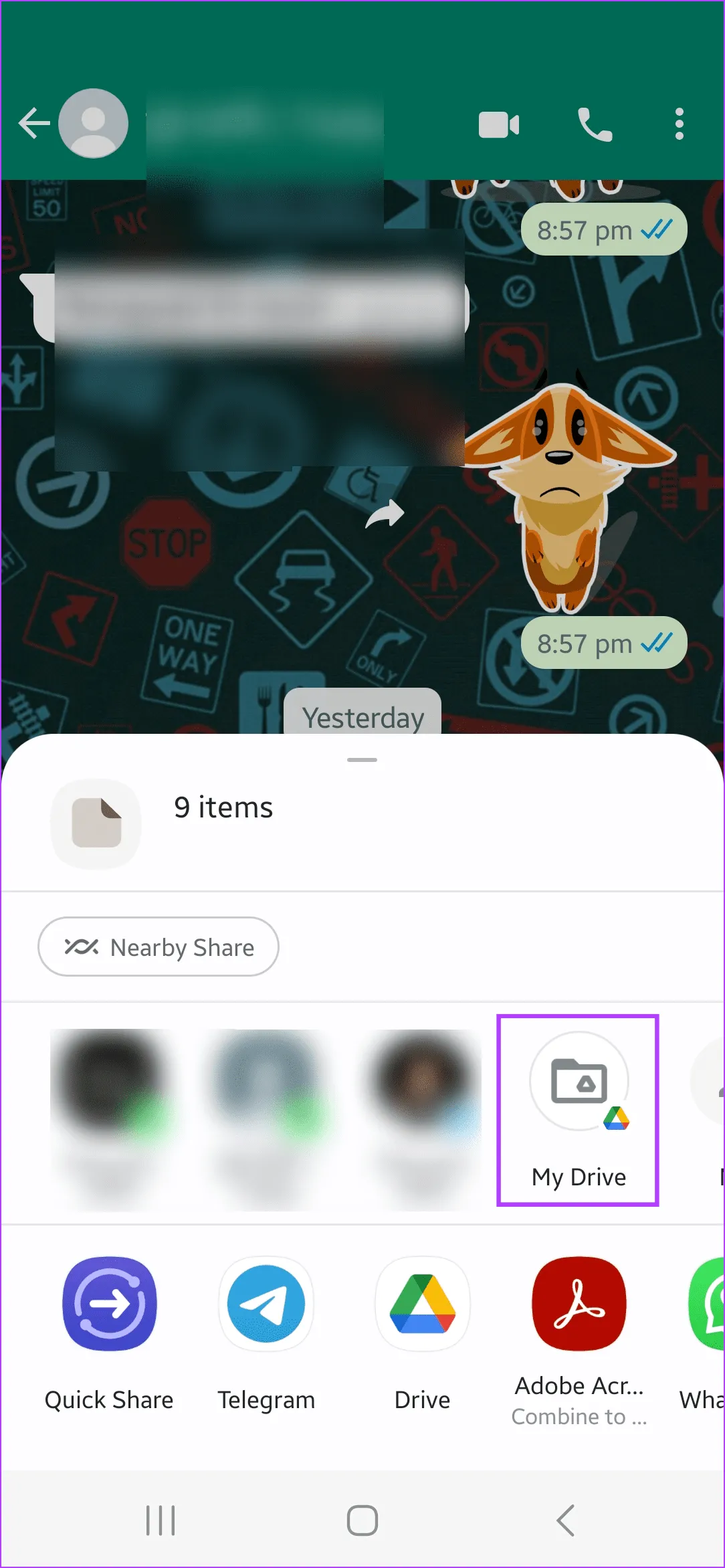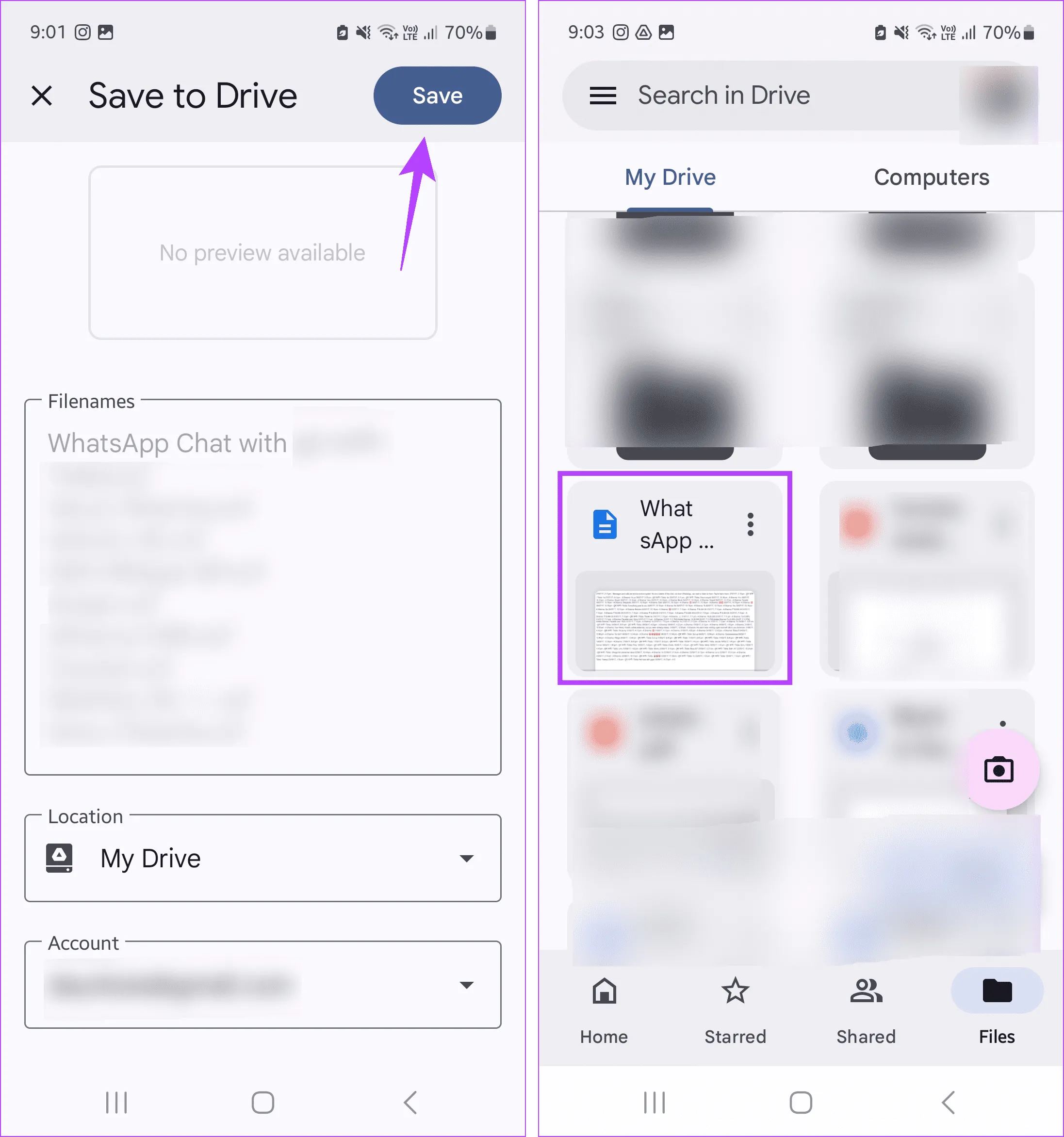مرحله 7: مطمئن شوید که حساب Drive صحیح انتخاب شده است.سپس روی Save در گوشه سمت راست بالا ضربه بزنید. مرحله 8: پس از اتمام، برنامه Google Drive را باز کنید.در اینجا، روی متن چت دانلود شده WhatsApp ضربه بزنید.