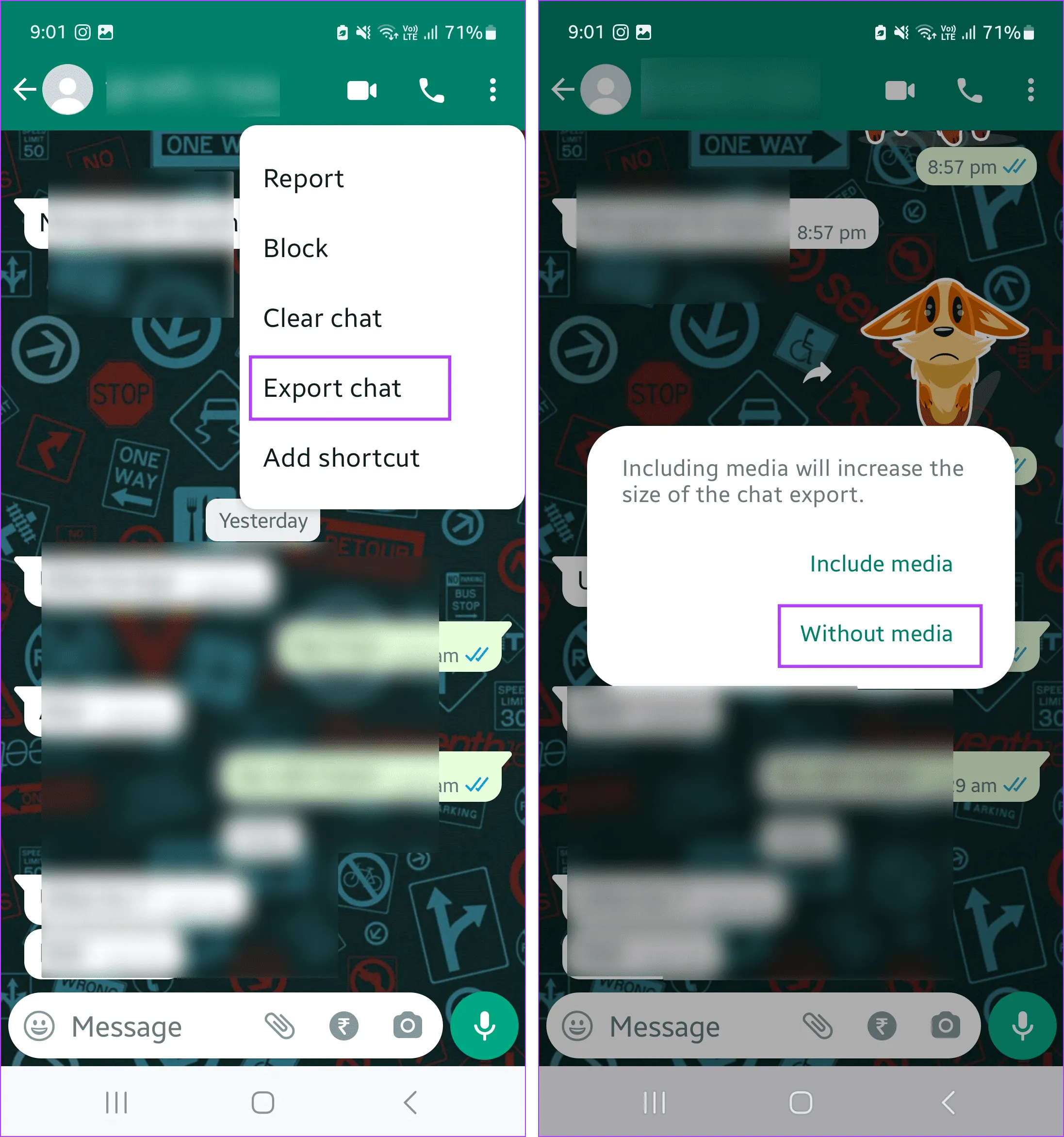 مرحله 4: در اینجا، روی Export chat ضربه بزنید. مرحله 5: از میان گزینه ها، بر روی Without media ضربه بزنید.