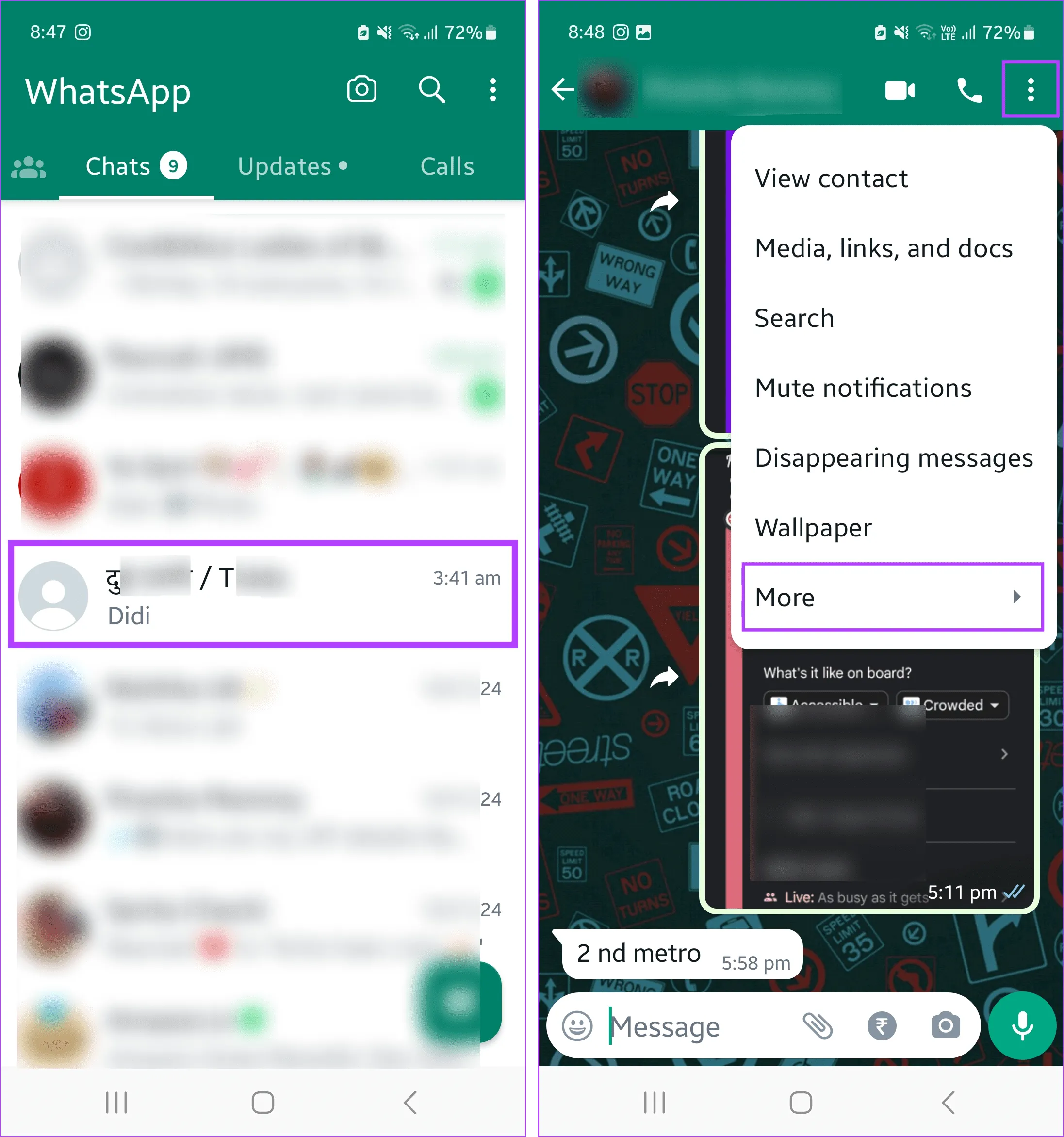 یکی از ساده ترین راهها برای یافتن اولین پیام در هر چت واتساپ، صادر کردن کپی آن به یک منبع خارجی، مانند Google Drive، دستگاه شما است..این رونوشت حاوی حداکثر 40000 پیام از گپ انتخابی خواهد بود که اولین پیام ابتدا نمایش داده می شود..همچنین می توانید از این برای رفتن به اولین پیام در گروه WhatsApp استفاده کنید.لطفاً توجه داشته باشید که برای دانلود یک کپی از تمام رسانه های داخل چت، باید گزینه Include media را انتخاب کنید..با این حال، بسته به رسانه موجود، ممکن است بارگیری بیشتر طول بکشد و فقط تا 10000 پیام صادر شود.اینجا.نکته: مقاله دیگر ما را بررسی کنید تا درباره صادرات چت WhatsApp در iPhone بیشتر بدانید. مرحله 1: برنامه WhatsApp Android را باز کنید.سپس روی مخاطب یا گروه مربوطه ضربه بزنید. مرحله 2: در اینجا، روی نماد سه نقطه در گوشه بالا سمت راست ضربه بزنید .مرحله 3: روی More ضربه بزنید.