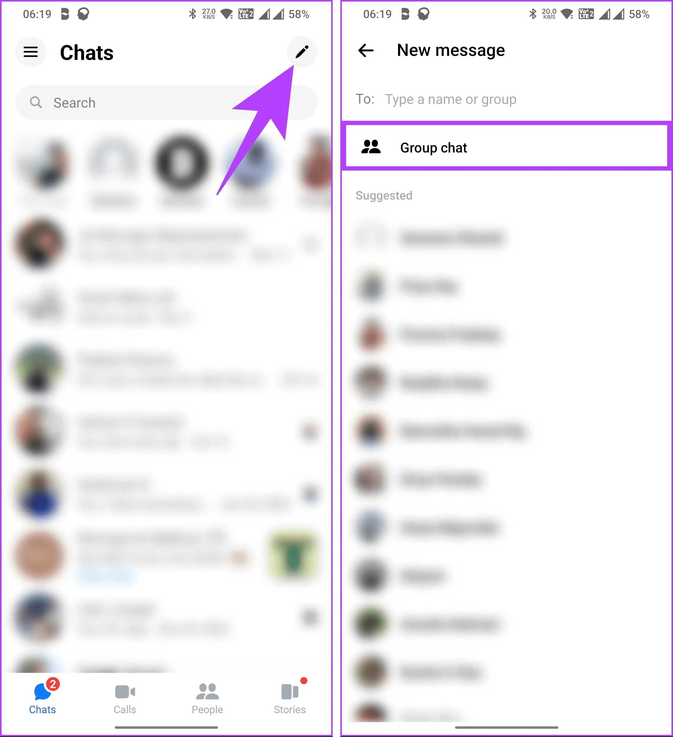 مانند دسکتاپ، این روش شامل ایجاد یک چت گروهی از طریق است.توجه: ما از فیس بوک مسنجر برای تظاهرات استفاده خواهیم کرد.با این حال، می توانید از رسانه دلخواه خود برای ارتباط با هر دو دوست خود استفاده کنید. مرحله 1: مسنجر فیس بوک را در اندروید یا آیفون خود راه اندازی کنید و روی نماد مداد در گوشه سمت راست بالا ضربه بزنید.