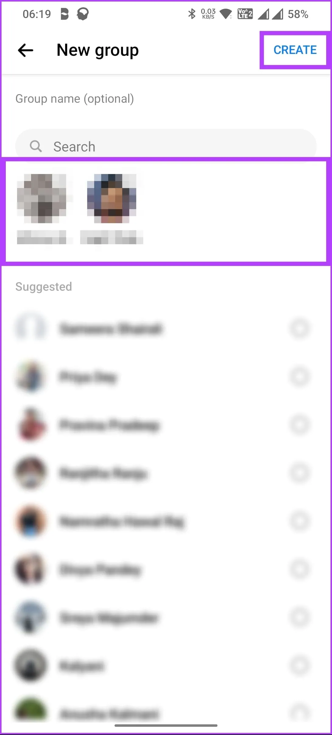 مرحله 2: در صفحه پیام جدید، روی چت گروهی ضربه بزنید.در صفحه بعدی، نمایهها (افزودن دوستانی که میخواهید به آنها متصل شوند) را برای افزودن به گروه جستجو کنید یا روی آنها ضربه بزنید..توجه: میتوانید نام گروه را تنظیم کنید یا آن را همانطور که هست بگذارید. مرحله 3: در نهایت روی Create در گوشه سمت راست بالا ضربه بزنید.گروه ایجاد خواهد شد.اکنون، یک پیام مقدماتی ارسال کنید.
