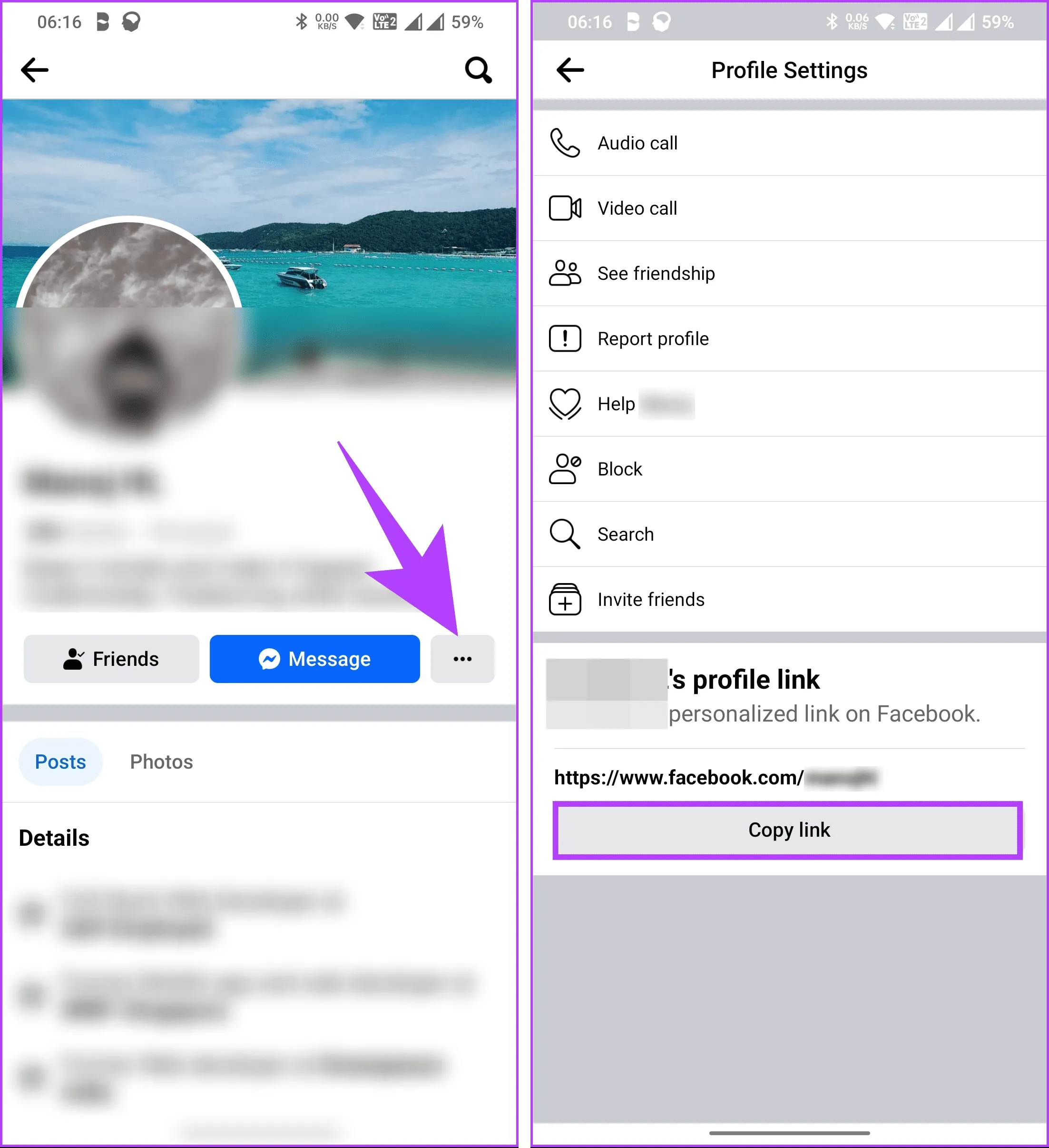 مرحله 1: برنامه فیس بوک را در اندروید یا آیفون خود راه اندازی کنید.پس از راه اندازی، به نمایها ی بروید که میخواهید با دوستان خود به اشتراک بگذارید. مرحله 2: یک بار روی شخص.در صفحه بعدی، در قسمت تنظیمات نمایه، به «پیوند نمایه [کاربر]» بروید و روی دکمه کپی پیوند ضربه بزنید..