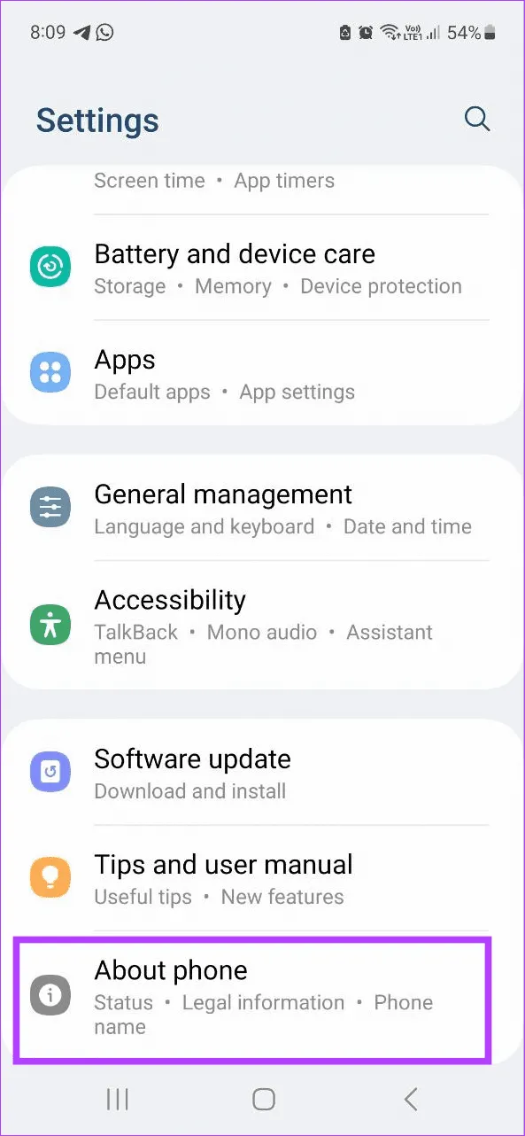فرض کنید دستگاه شما تنظیم شده است که USB را برای هر چیزی غیر از هدف شارژ تشخیص دهد.در این صورت، ممکن است هنگامی که شارژر را از دستگاه خود جدا کنید، یک اعلان قطع وصل دائمی را راه اندازی کند.در این حالت، میتوانید از گزینه های توسعه دهنده در دستگاه خود استفاده کنید و آن را طوری تنظیم کنید که USB را برای شارژ کردن گوشی شناسایی کند و نه چیز دیگری. مرحله 1: تنظیمات را باز کنید و روی درباره تلفن ضربه بزنید.