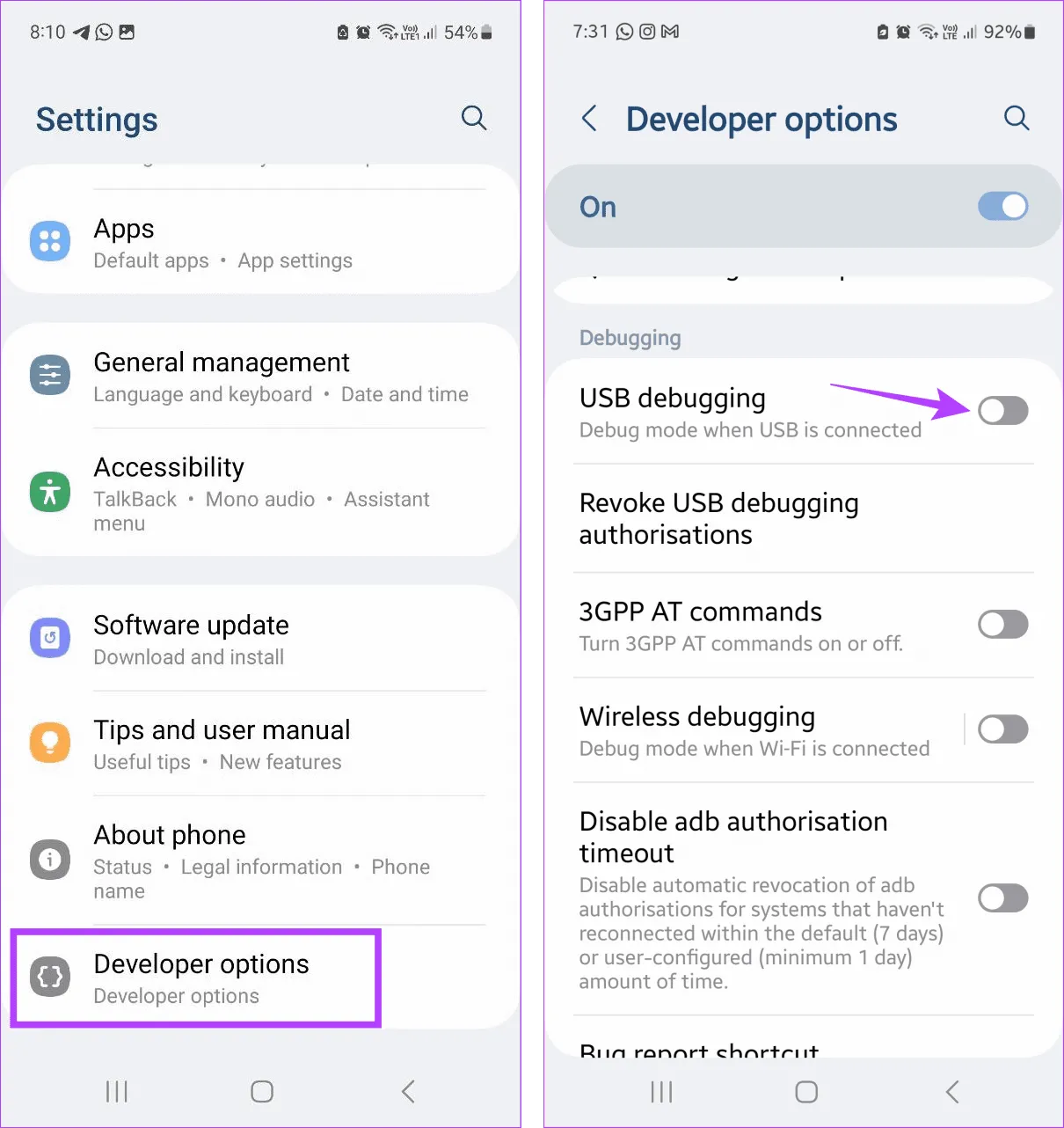 مرحله 4: اکنون، منوی اصلی تنظیمات را باز کنید و به پایین بروید.در اینجا روی Developer options ضربه بزنید. مرحله 5: ابتدا کلید را برای اشکال زدایی USB روشن کنید.