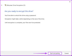 مرحله 13: برای شروع فرآیند رمزگذاری درایو، روی Start encrypting کلیک کنید.
