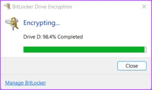 مرحله 14: منتظر بمانید تا درایو رمزگذاری شود و پس از تکمیل رمزگذاری، روی Close کلیک کنید.