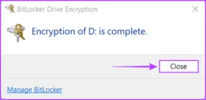 مرحله 4: منتظر بمانید تا درایو خودش را رمزگشایی کند و پس از اتمام رمزگشایی، روی Close کلیک کنید. سپس کامپیوتر خود را مجددا راه اندازی کنید.