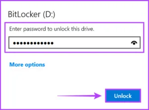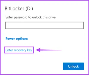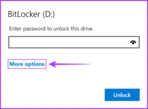در ضمن اگر رمز BitLocker را فراموش کردید می توانید بر روی دکمه more options در زیر فیلد رمز عبور کلیک کرده و سپس کلید بازیابی Enter را بزنید.