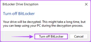 مرحله 3: هنگامی که یک گفتگوی تایید ظاهر شد، روی گزینه “Turn off BitLocker” کلیک کنید.