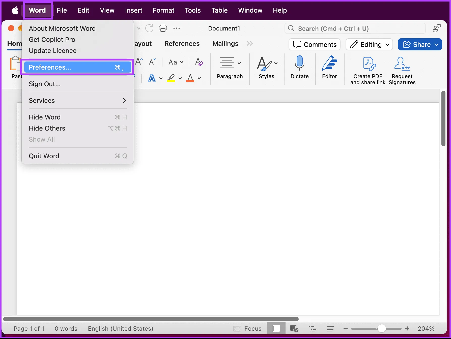 مرحله 2: پس از راه اندازی، به گزینه Word در نوار ابزار بروید و از منوی کشویی گزینه Preferences را انتخاب کنید..توجه: از طرف دیگر، برای باز کردن تنظیمات برگزیده، Command را فشار دهید.