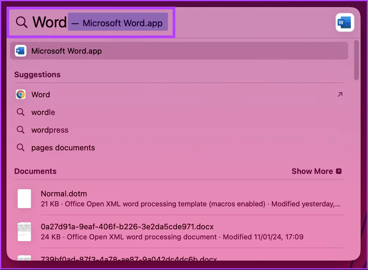 بر خلاف ویندوز، مراحل فعال کردن تب توسعه دهنده روی روبان در Word در مک کمی متفاوت است.مراحل ذکر شده در زیر را دنبال کنید .مرحله 1: کلیدهای Command Spacebar را روی صفحه کلید خود فشار دهید، Word را تایپ کنید و کلید Return را فشار دهید تا Microsoft Word در مک شما راه اندازی شود..