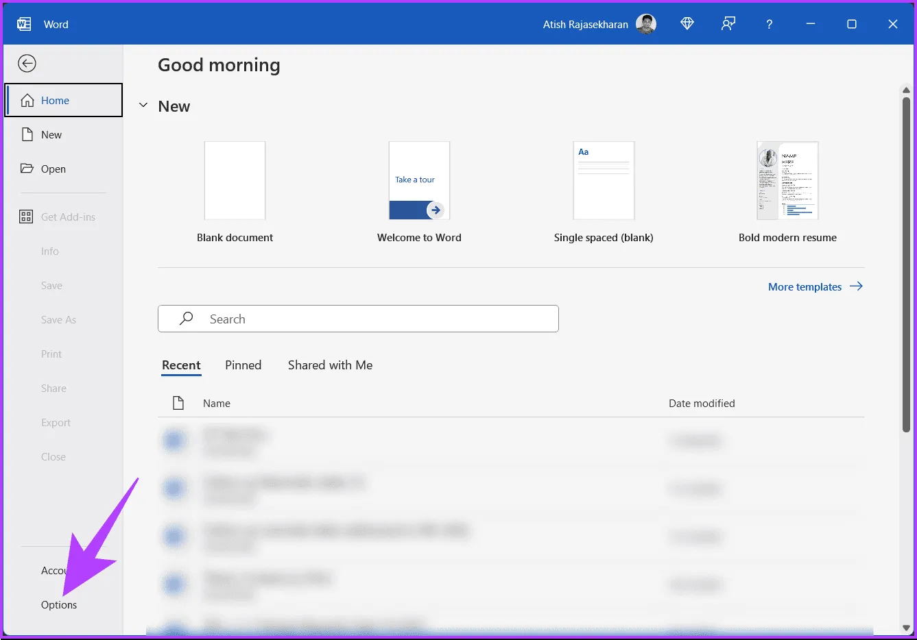مرحله 3: گزینه ها را در گوشه پایین سمت چپ انتخاب کنید.با این کار پنجره Word Options بر روی صفحه نمایش شما باز می شود.