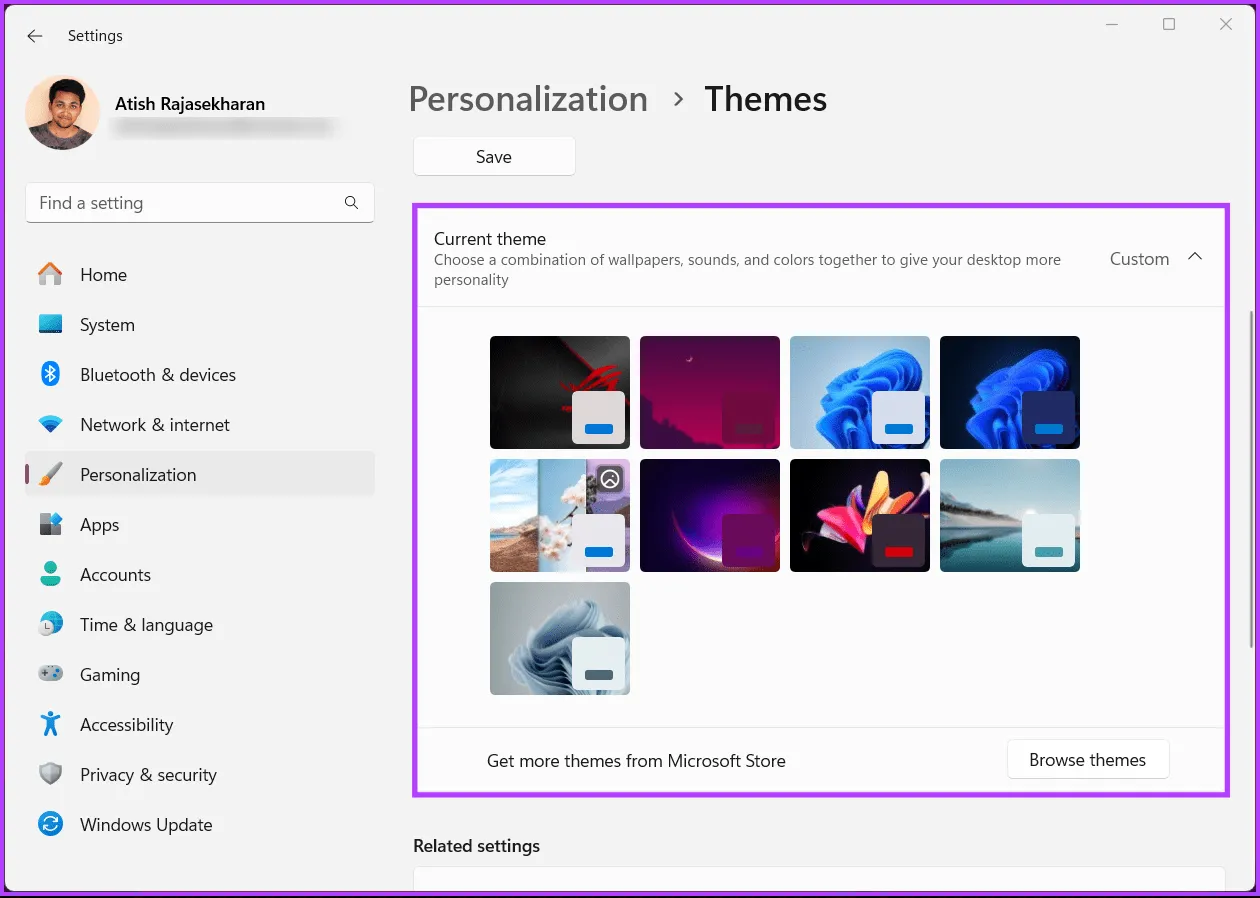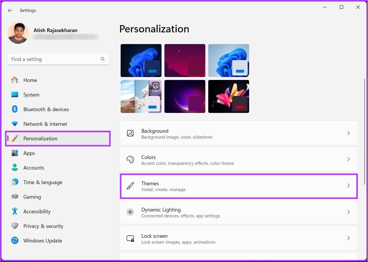 مرحله 2: به Personalization بروید و Themes را از قسمت سمت راست انتخاب کنید.