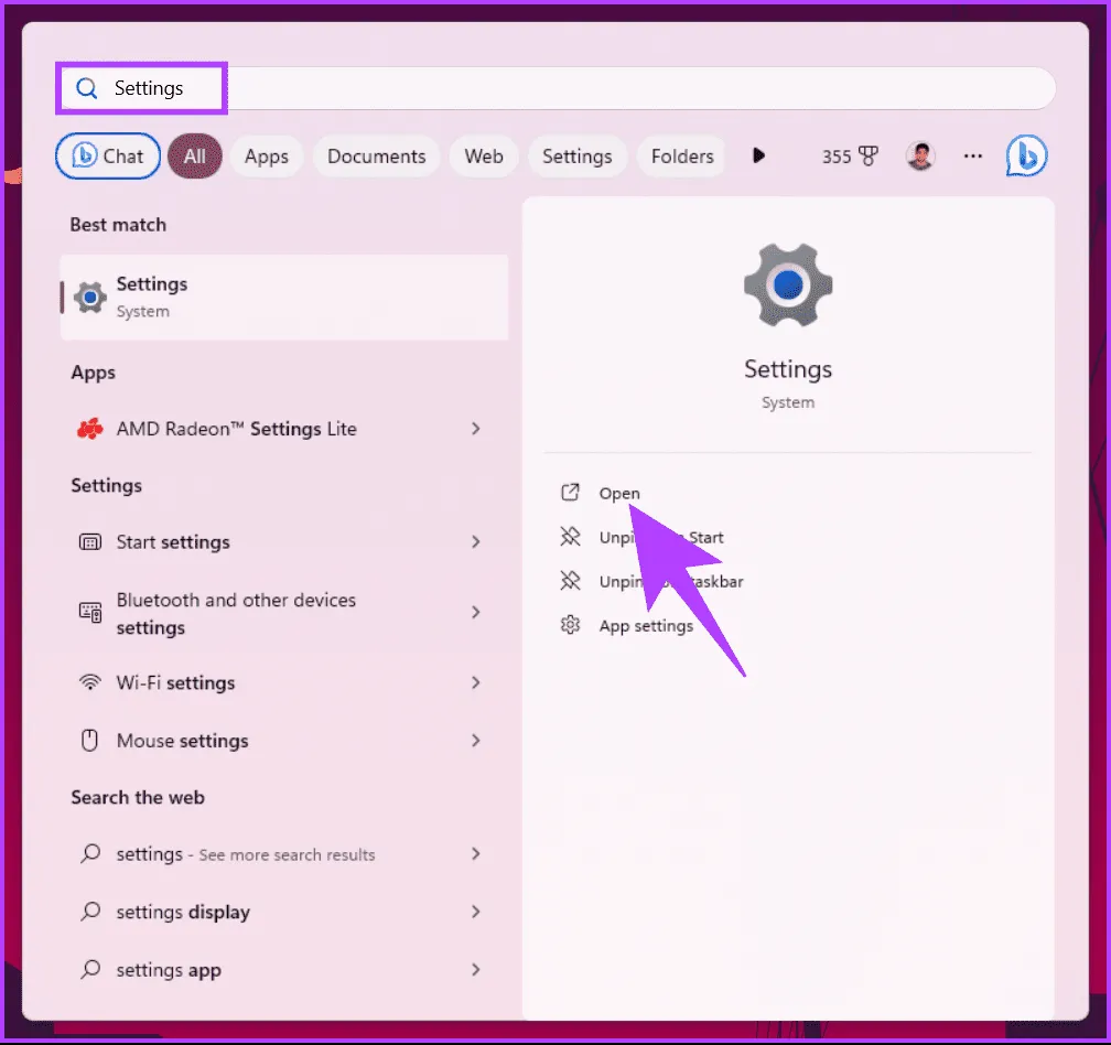 تغییر رنگ نوار وظیفه با استفاده از تنظیمات شخصی سازی در ویندوز 11 ساده است.مراحل زیر را دنبال کنید. مرحله 1: کلید Windows را روی صفحه کلید خود فشار دهید، Settings را تایپ کنید و روی Open کلیک کنید.